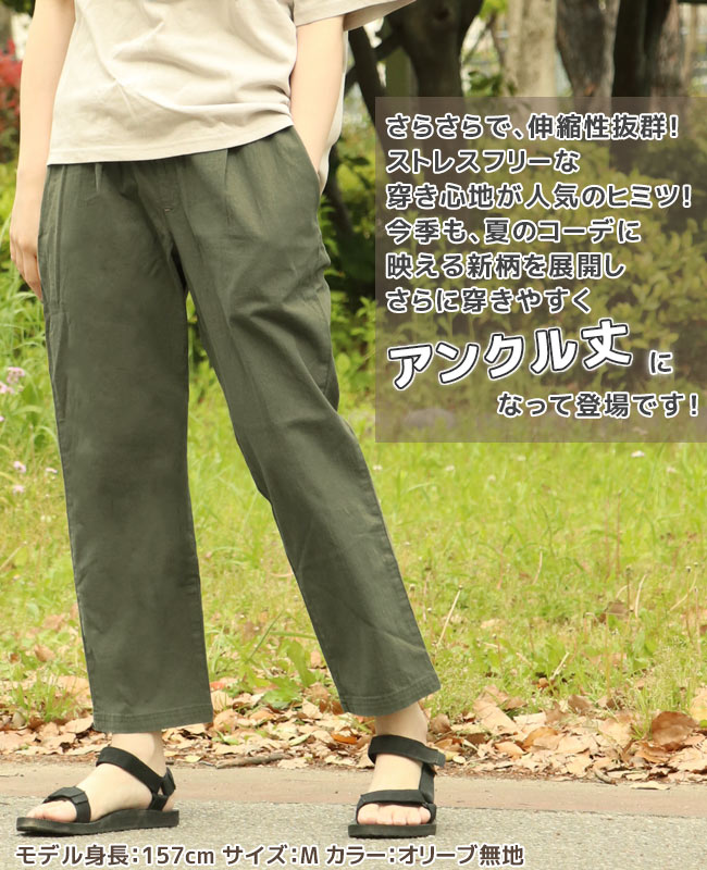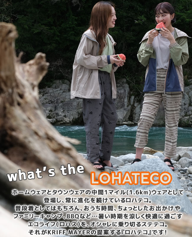 | 《KRIFF MAYER 春夏定番人気アイテム「冷感ロハテコアンクル丈」》 毎年定番のLOHATECO。 今期はより穿きやすいアンクル丈で登場です! おうち時間のリラックスタイム、暑い夏でもオシャレに、快適に♪ リラクシングなエコライフ“ロハス”なステテコ=ロハテコ。 楽チンなルームウェアとしてはもちろん 野暮ったくならないおしゃれな柄だから、ちょっとしたお買い物にもOK。 キャンプシーンにあうオリジナル柄5つと 普段ばきしやすいソリッドカラー、マルチカラーを展開しております。 夏に最適なドライタッチでストレッチ性のある素材を使用しており 接触冷感加工で快適に過ごせ、旅行やキャンプのお供にオススメのアイテムです。 レディースは膝から裾にかけてすっきりとしたテーパードデザイン。 下着などのシルエットを拾わない腰周りゆったりなシルエットでリラックス感有り着心地抜群◎ ※商品の特性上、1点毎に柄の出方が異なります。 こちらのアイテムは、同コンセプトのメンズサイズ(品番:2247806)とキッズサイズ(品番:2247842K)が ございますので、親子お揃いコーデやリンクコーデをお楽しみいただけます。 【対象 ※以下のような方に多くご利用いただいております。】 年代:10代、20代、30代、40代、50代〜 | ||||||||||||||||||||||||||||||||||||||||||||