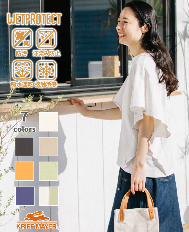 | 《KRIFF MAYER 春夏アイテム「ウェットプロテクト袖フレアT」》 暑い日でも汗が滲みにくいオリジナル素材「WET PROTECT」を使用したデザインTシャツです。 ブラウスの様な見た目のカットソーでキレイめにもカジュアルにも使えて楽ちん。 毎年大人気アイテムのモモンガT(品番:2347829L)とは対照的な、女性らしいフレアデザイン! 程よくゆったりとしたカジュアルシルエットで甘くなり過ぎず、パンツなどにも合わせやすいです。 ウエストをINして着こなし方を変えると、また違った表情になり着回しも抜群!! お尻も隠れる丈で体型カバーにもなり使いやすく幅広い年齢層が着用できるアイテムです。 ●WETPROTECT この商品は生地加工により防汚・汗染みを防ぐ特徴と吸水速乾性を持った素材を使用したアイテムです。 生地加工の為、ご家庭での使用状況や、洗濯方法で効果に個体差が出ます事をご了承下さいませ。 【対象 ※以下のような方に多くご利用いただいております。】 年代:10代、20代、30代、40代、50代〜 | |||||||||||||||||||||||||||