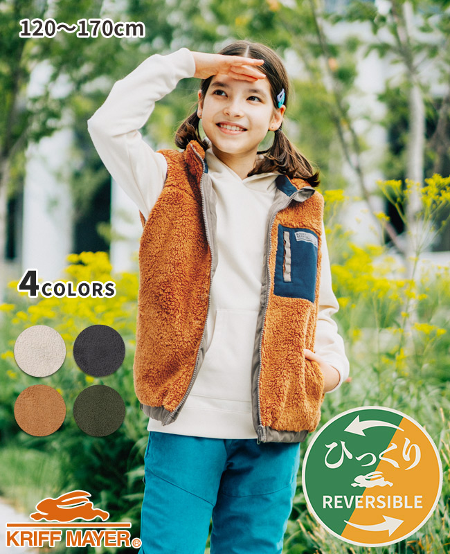 | 《KRIFF MAYER 秋冬アイテム「ひっくりベスト」》 ■ポイント 毎年人気のひっくりベスト タフタ面とボア面の両方を楽しめる2WAYデザイン。 リバーシブルで気温や気分に合わせて簡単イメチェン! 着やすいながらもクリフメイヤーらしい個性的な配色 胸ポケットがスウェット素材になりアップデートしました! ベストタイプなので季節の変わり目にも活躍します。 また、好みのシャツやスウェットなど、 気軽にレイヤードコーデを楽しめます。 通学からお出かけ、キャンプやアウトドア使いにも映えるオススメアイテムです! 小学校低学年〜高学年の、キッズ〜ジュニアサイズに加え、 メンズSサイズ以下だけどキッズの160cmでもない。。。 そんな微妙な時期のお子様に対応する170cmまで! 【対象年齢・学年】 5歳、6歳、7歳、8歳、9歳、10歳、11歳、12歳、13歳、14歳、15歳、16歳、17歳 幼稚園年長、小学校1年生、2年生、3年生、4年生、5年生、6年生、中学校、高校生ぐらいまで、 幅広い年齢層に着用いただける、120cm 130cm 140cm 150cm 160cm 170cmの豊富な6サイズ展開です! | ||||||||||||||||||||||||||||||||||||||||||