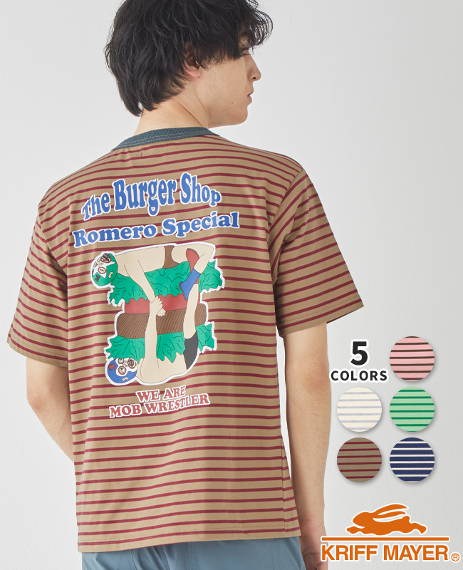 | 《MOB WRESTLERシリーズ第2弾》 今シーズンは半袖Tシャツが登場です。 夏にぴったりなポップなボーダーをベースにした楽しくなるアイテムです。 グラフィックはレスラーたちが架空のハンバーガーショップをオープンした際のフライヤーをイメージし、プロレスの技「ロメロスペシャル」にちなんだ遊び心満載のグラフィックです。 フロントは左胸位置に生地切替されたポケットをプラス。 ロゴ刺繍も配しています。 ユニセックスアイテムとしておすすめです。 | |||||||||||||||||||||||||||