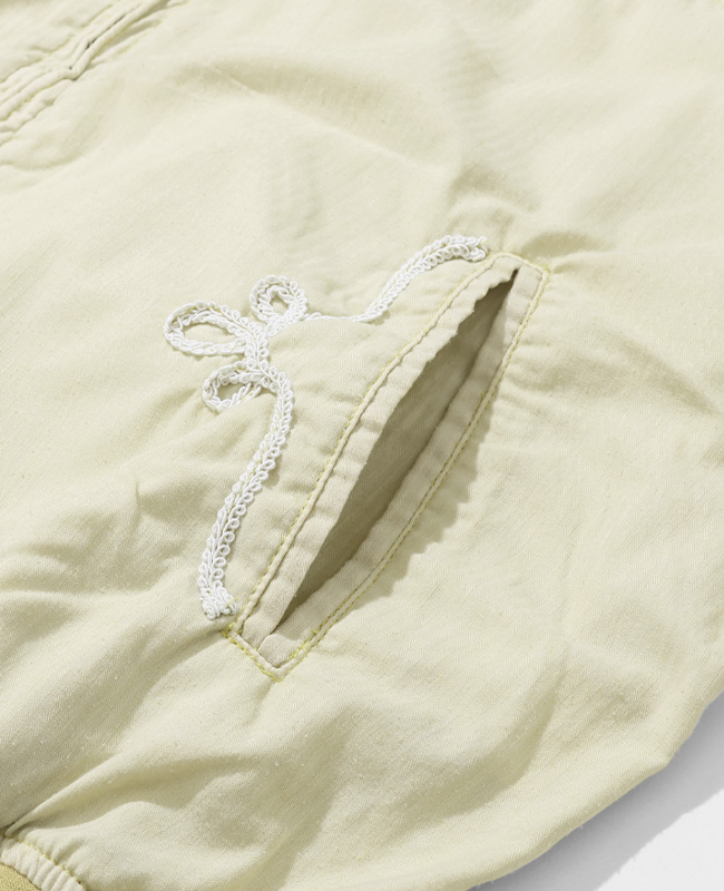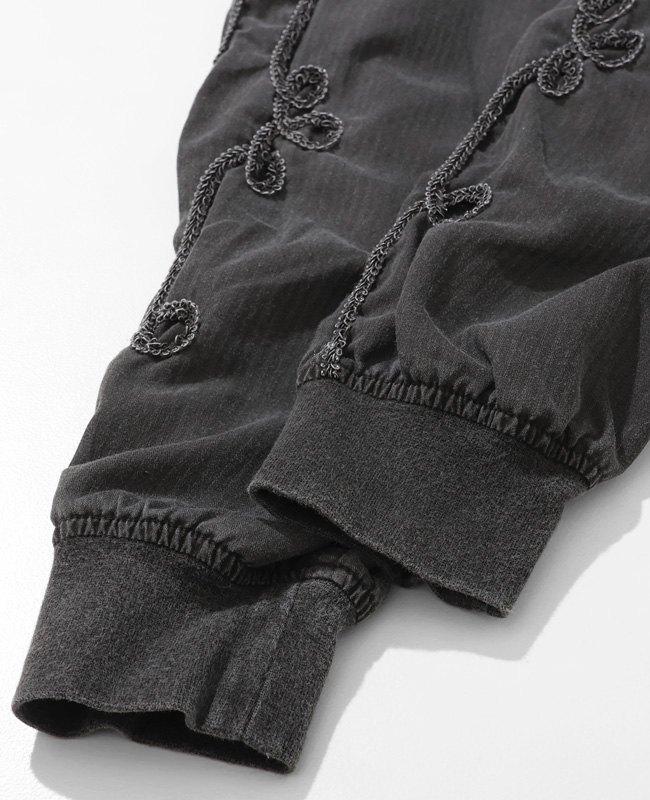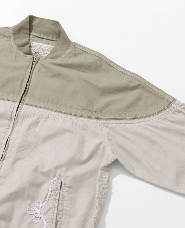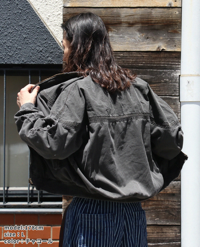 | 60年代から80年代にスケーターやパンク、ハードコアシーンで人気を博した「ダービージャケット」。 ダービージャケット特有のパターンデザインに着目し、レーヨンとコットンをハイブリッドした高密度のアロハ生地とコットンヘリンボーン生地をパーツ使いし、製品にて染め仕上げしています。 アロハ生地の鈍い光沢とヘリンボーンの表情が同色で合い交わることで、パーツごとに表情の異なる奥行きのあるデザインに。 ウエスタン調の刺繍デザインを施して、オリジナリティのあるダービージャケットへと変貌させています。 | ||||||||||||||||||||||||||