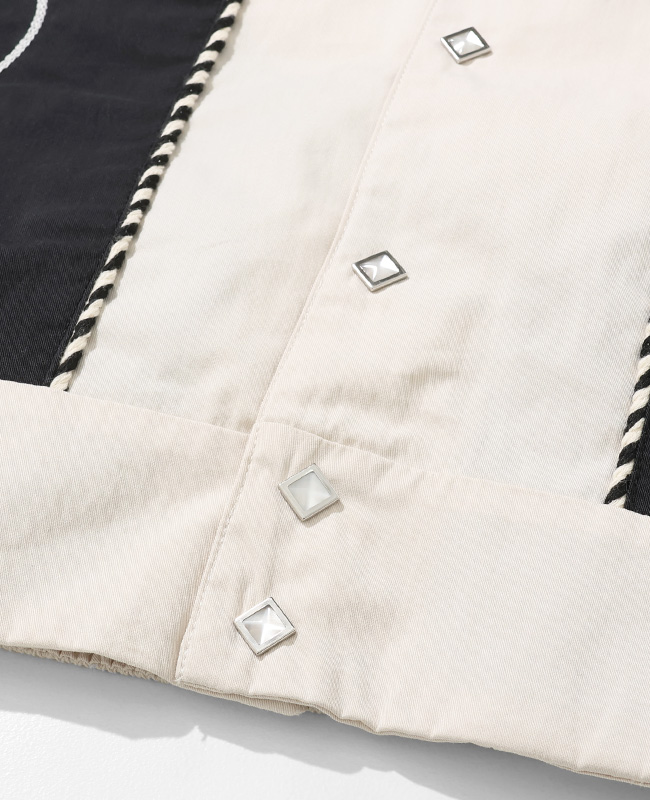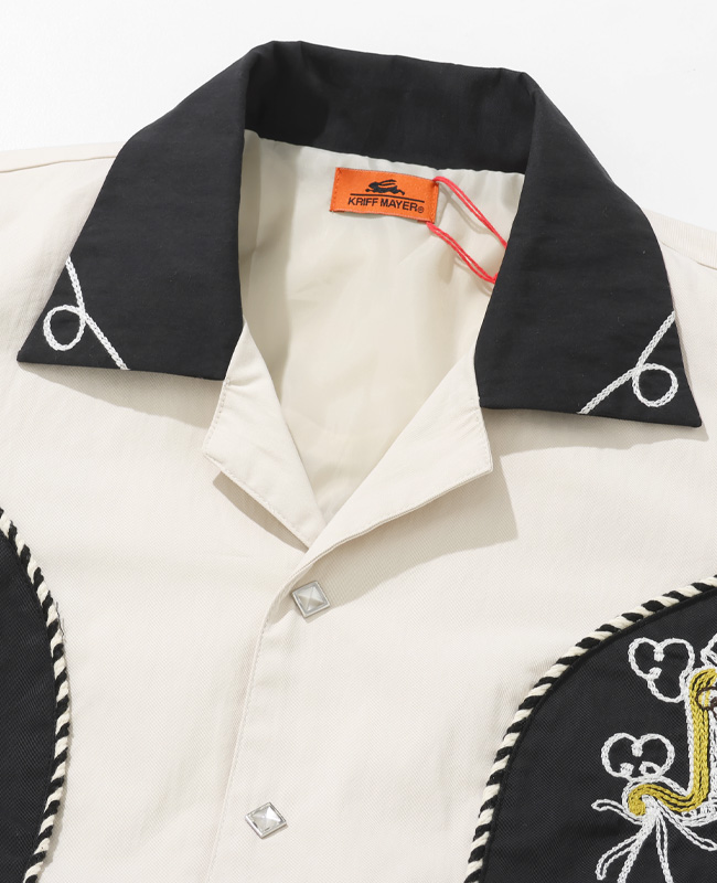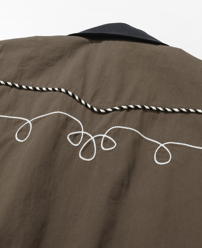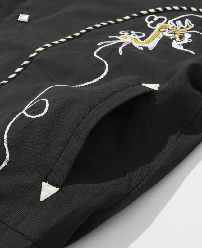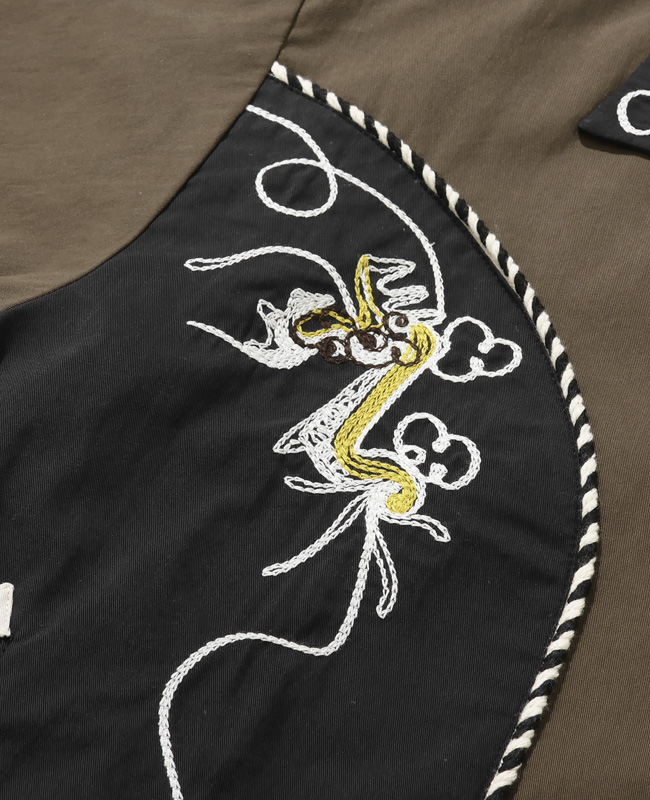 | 50年代のウエスタンジャケットをベースにモデファイ。 随所に施された刺繍はチェーン刺繍を2本使いした贅沢な仕様です。 フロントはベトジャン刺繍のグラフィックを組み合わせた、個性的なグラフィックが目を惹きます。 重ね着のしやすいタフタの裏地付き。 レイヤードスタイルに映えるオープンカラー仕様。 短丈に裾ゴムを強く絞ったウエストを強調するデザインのため、ワイドパンツとの組み合わせがオススメです。 | ||||||||||||||||||||||||||||||||