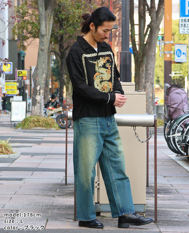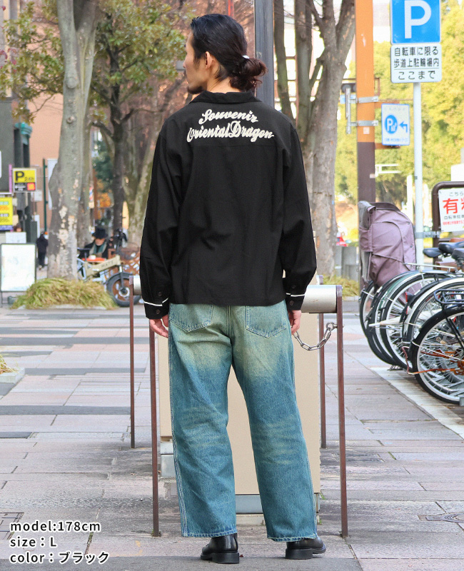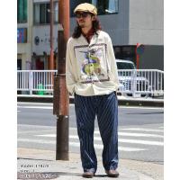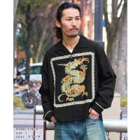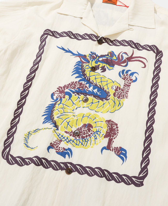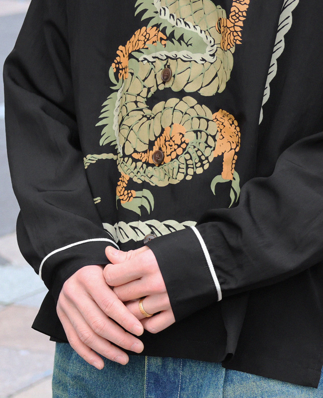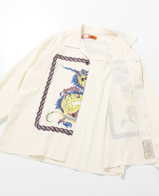 | 個性的なグラフィックをフロントにプリントした長袖オープンカラーシャツです。 50年代頃のヴィンテージシャツに見られたインパクト大なグラフィックをサンプリング。 フロントを開けて着ても、閉めて着ても目を惹く特徴的な1枚です。 背ヨーク部分の刺繍は特殊な技法で糸密度を高めて立体感を強調。 力強い印象のロゴ刺繍に仕上げました。 | ||||||||||||||||||||||||||||||||