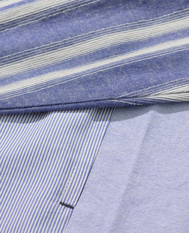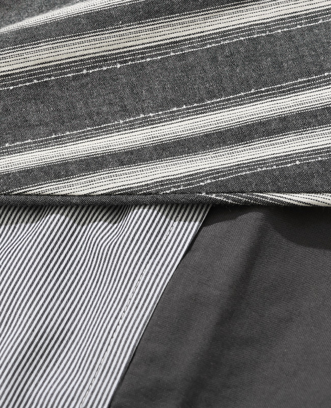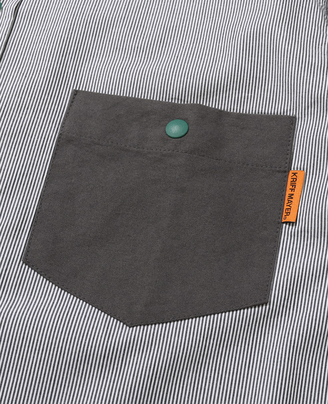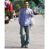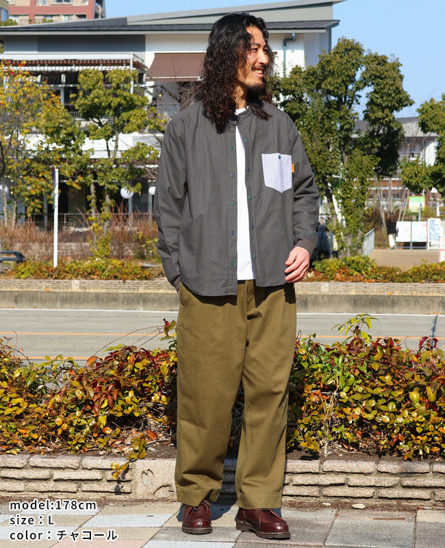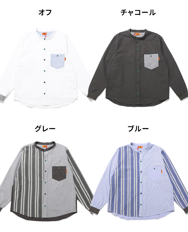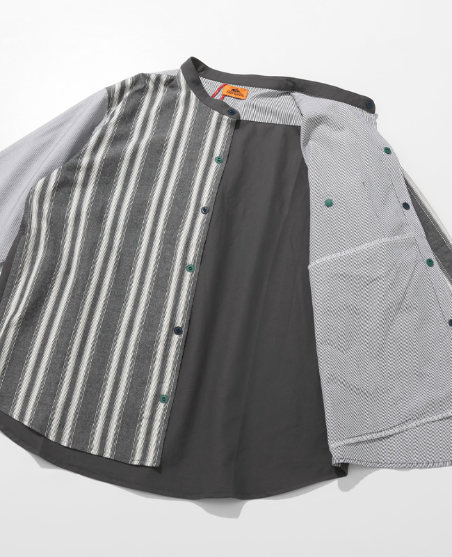 | スナップボタンの配色と切替デザインが特徴的なハッピーシャツが登場! こちらは首元スッキリなバンドカラーデザインとなっています。 無地ベースと、同系色のストライプを掛け合わせた2パターンを展開。 フロントは開け閉めが簡単にできるスナップボタンを採用。 洗い場などで簡単に腕まくりができるよう袖口リブ仕様に。 サラッとした生地感で、気軽に羽織れるのも嬉しいポイントです。 トップス使いはもちろん、インナー使いにも映える長袖シャツです。 | ||||||||||||||||||||||||||||||||