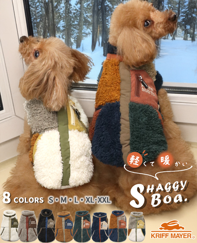 | 《KRIFF MAYER 秋冬アイテム「DOGシャギーボアベスト」》 ふわふわの触り心地が気持ちよく、アウトドアライクなデザインが特徴的な KRIFF MAYER の代表アイテムであるシャギーボアのドッグウェアです。 今年は、ご要望にお応えしてハーネス穴を追加! デザインを邪魔しないように穴は表面上見えないようになっています! スタンドネックで首元までぬくぬく♪ 面ファスナーで首は開くので着脱も簡単です! 寒い日にアウターとして活躍する一枚。 もちのびなどとレイヤードして着用いただくのがより暖かくておすすめです。 コーデュロイポケットやパイピング、ボアの配色まで人間サイズの魅力溢れるシャギーボアデザインをそのまま落とし込み忠実に再現! 男の子がカッコよく、女の子が可愛く着用できるカラーを取り揃えております。 こちらのアイテムは同素材・同コンセプトのメンズサイズ(品番:2514400)レディースサイズ(品番:W2514407) キッズサイズ(品番:J2514413)も展開しているので家族でお揃いコーデをお楽しみいただけます! 他にないドッグウェアで他のわんちゃんと差別化しちゃおう! ※従来のXLサイズがXXLサイズ表記になり新しいXLサイズにリニューアルしています。 ※アイテムによってサイズ感が異なる為、数値をよくお確かめください。 | ||||||||||||||||||||||||||||||||||||||