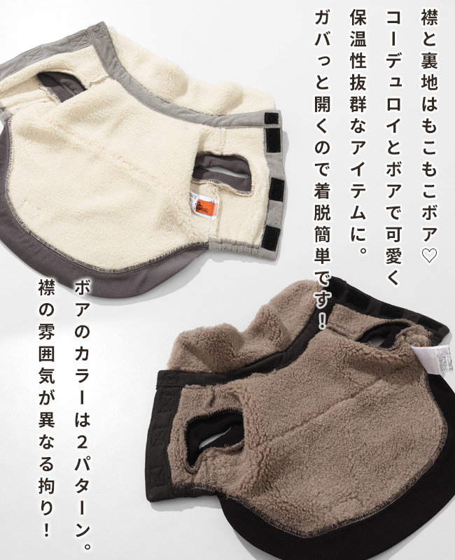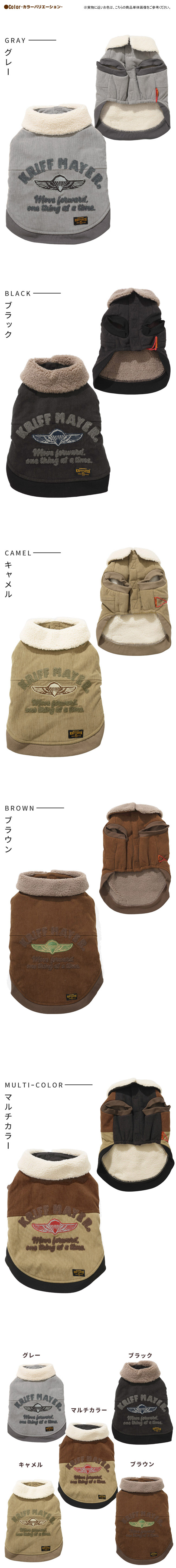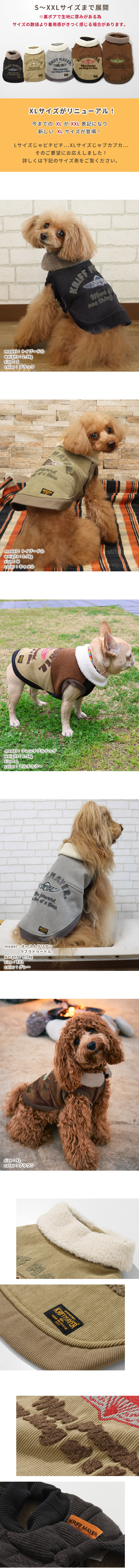 | 《KRIFF MAYER 秋冬アイテム「DOG裏ボアコーデュロイボンバーJK」》 柔らかく軽量で暖かい!コーデュロイとボアをボンディングしたオリジナル素材を使用し ヴィンテージにはない軽さ柔らかさ暖かさを兼ね備えたボンバージャケットが実現しました!! 前開きなのでお散歩前にさっと着せることができ防寒対策にもなります。 背面のフライトジャケット風のアップリケと刺繍が取り付けられたコーディネートの主役になれるデザインと ボアの襟が何とも言えない上品さかっこよさ可愛さを引き出してくれます! 他にないドッグウェアで他のわんちゃんと差別化できる一枚です。 こちらのアイテムは同コンセプトのオーナーアイテム(品番:2525106)がございますので、お揃いコーデをお楽しみいただけます! ※裏がボアで生地に厚みがある為、サイズの数値より着用感がきつく感じる場合があります。 ※ハーネス穴はございません。 ※従来のXLサイズがXXLサイズ表記になり新しいXLサイズにリニューアルしています。 ※アイテムによってサイズ感が異なる為、数値をよくお確かめください。 | ||||||||||||||||||||||||||||||||||||||||||
