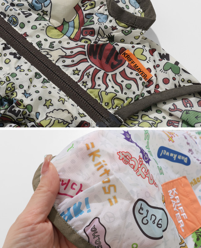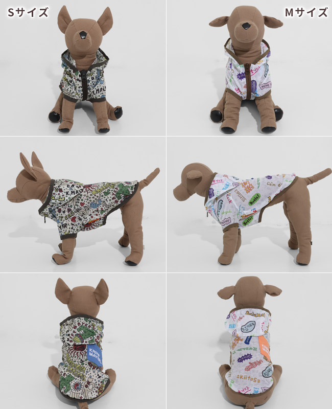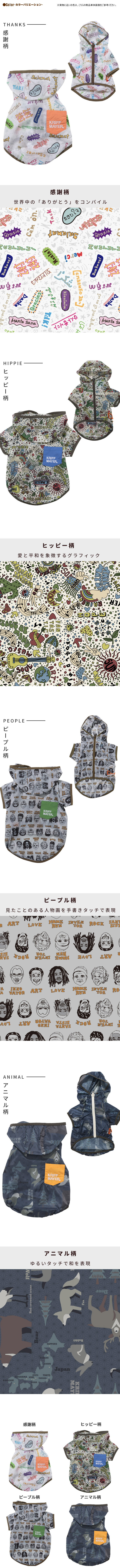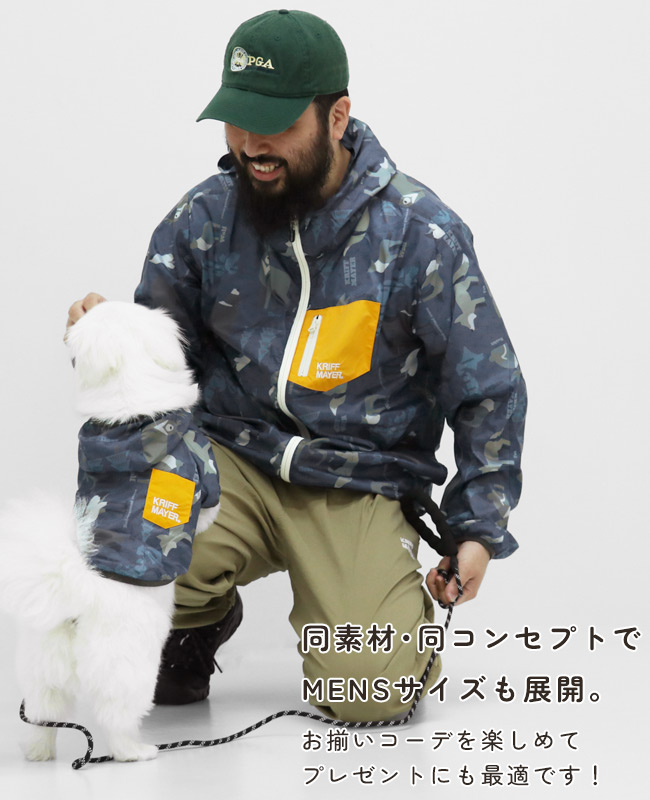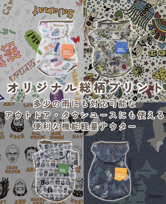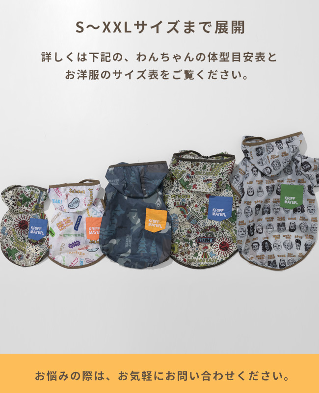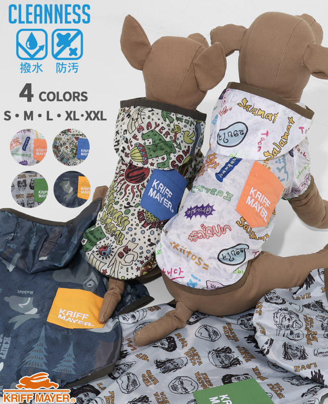 | 《KRIFF MAYER 春アイテム「DOGクリーネス総柄フードJK」》 KRIFF MAYERオリジナル総柄の撥水マウンテンパーカーです。 ・世界中の「ありがとう」を集めた感謝柄 ・根強い人気のヒッピー柄 ・どこかで見たことのある人物画を手書きタッチで表現したピープル柄 ・ゆるいタッチで和を表現したアニマル柄 撥水防汚機能付きなのでアウトドアに適しており、軽量かつファスナーで前がガバっとあき 着脱簡単で、わんちゃんにもオーナー様にもストレスなくご利用いただけます。 総柄とポケット配色で目を惹くこと間違いなし! 他にないドッグウェアで他のわんちゃんと差別化できる一枚です。 こちらのアイテムは同素材・同コンセプトのメンズアイテム(品番:2537804)が ございますので、お揃い・ペアルック・リンクコーデをお楽しみいただけます! ■CLEANNESS(クリーネス) この商品は、撥水・防汚加工を施した商品です。 完全防水ではないので、強い雨等に長時間あたると水分が浸透します。 内側からの湿気も通すので、ムレにくい特性を持ちます。 ※撥水/防汚加工は永久ではありません。 工場にて30回洗濯後に、効果に変わり無い事を確認していますが、使用状況や洗濯方法で個体差が出ますのでご了承下さい。 ※ハーネス穴はございません。 ※アイテムによってサイズ感が異なる為、数値をよくお確かめください。 | ||||||||||||||||||||||||||||||||||||||||||