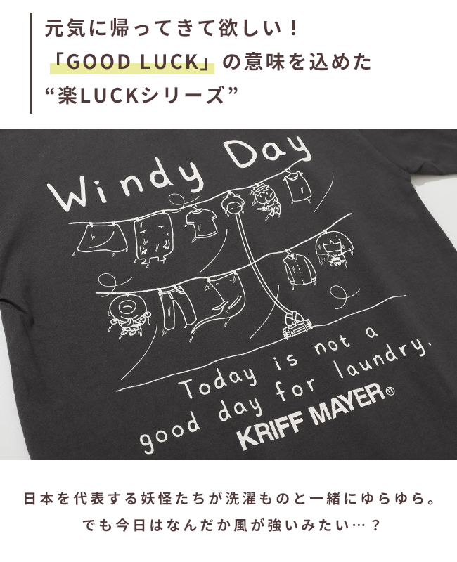 | 《KRIFF MAYER 2026春アイテム「楽LUCK七分袖Tシャツ(日本の妖怪)」》 クリフメイヤーの人気“楽LUCKシリーズ”より 洗濯されて干されている(なぜ?)日本を代表する妖怪たちが可愛い、 七分袖のプリントTシャツが登場! でも今日はちょっと風が強く洗濯には向いてないみたいですが、なにやら楽しげな妖怪も? 暑すぎず寒すぎずの7分袖は体温調節しやすく 季節の変わり目にも活躍する事まちがいなし! 吸汗・通気性に優れた綿100%素材だから お肌に優しくて夏でもさらっと快適◎ 通学からお出かけ、キャンプなどのアウトドアにもおすすめです。 『 楽LUCKシリーズ 』 お手頃価格で楽に着られる! 元気に帰ってきてほしいGOODLUCKの意味も込めた オリジナルデザイン 小学校低学年〜高学年の、キッズ〜ジュニアサイズに加え、 メンズSサイズ以下だけどキッズの160cmでもない。。。 そんな微妙な時期のお子様に対応する170cmまで! 【対象年齢・学年】 5歳、6歳、7歳、8歳、9歳、10歳、11歳、12歳、13歳、14歳、15歳、16歳、17歳幼稚園年長、小学校1年生、2年生、3年生、4年生、5年生、6年生、中学校、高校生ぐらいまで、 幅広い年齢層に着用いただける、120cm 130cm 140cm 150cm 160cm 170cmの豊富な6サイズ展開です! | ||||||||||||||||||||||||||||||||||||||||||