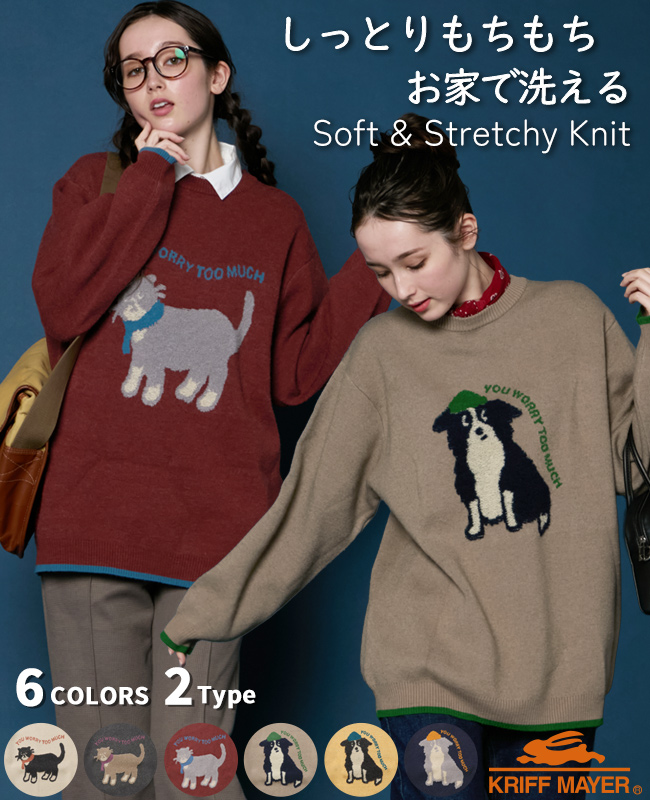 | 《KRIFF MAYER 秋冬アイテム「もちのびニット(犬派!?猫派!?)」》 ぜひ触ってみてほしい! もっちりとした独特の触り心地と、動きやすい伸縮性が特徴の ねこ柄・いぬ柄が選べるアニマルチュニック丈ニットです。 目の詰まった編み方と、ポリエステルやナイロンの糸を使用することにより 糸が補強され家庭洗濯が可能なお手入れしやすい嬉しいアイテム! スウェットのように着やすく、ウールを使用していないので肌あたりも優しくチクチクしにくいのが魅力。 モコモコした編み方が使用された立体感のある柄に、ジャガード特有の糸色がミックスされた生地感で のっぺりせず奥行きのある見た目になっており、袖口や裾の配色が可愛い一枚。 人の世界は心配事だったり、気を揉むことが多いので、「you worry too much」(心配しすぎだよ)と 人間に文句を言っている様な何とも言えない愛くるしい表情の犬猫をグラフィックに! 少しでも、絵柄を見た人の肩の力が抜けたらいいなという想いから生まれたアイテムです。 【対象 ※以下のような方に多くご利用いただいております。】 年代:10代、20代、30代、40代、50代〜 | |||||||||||||||||||||||||||