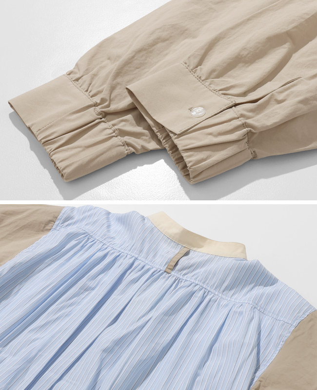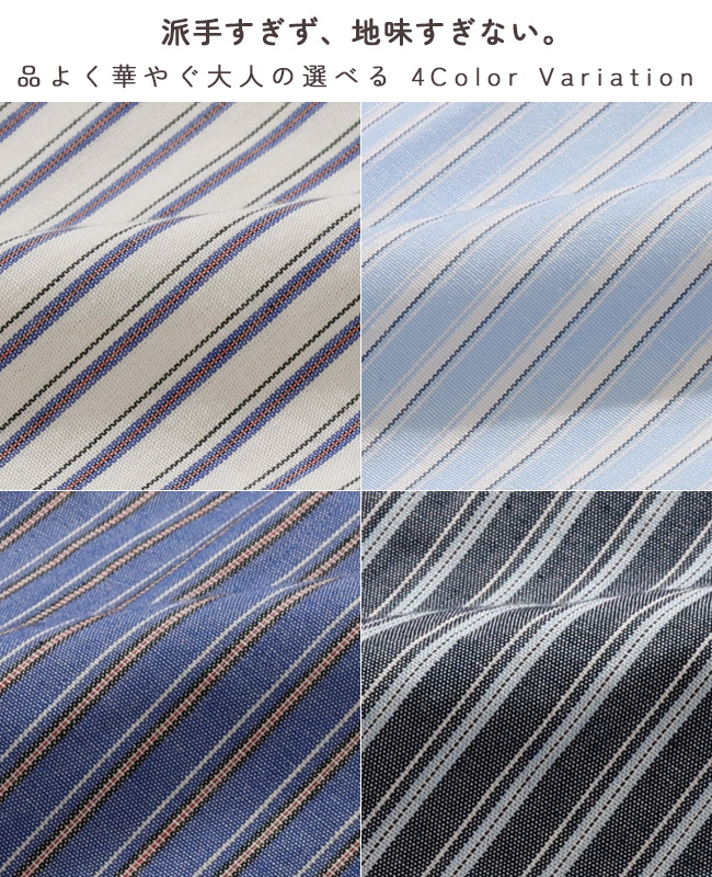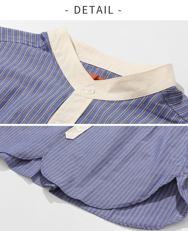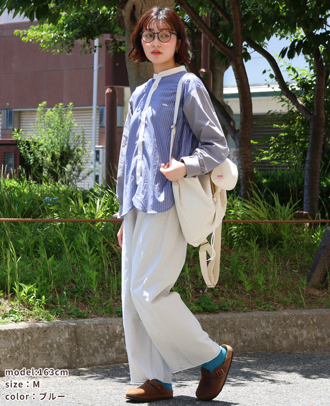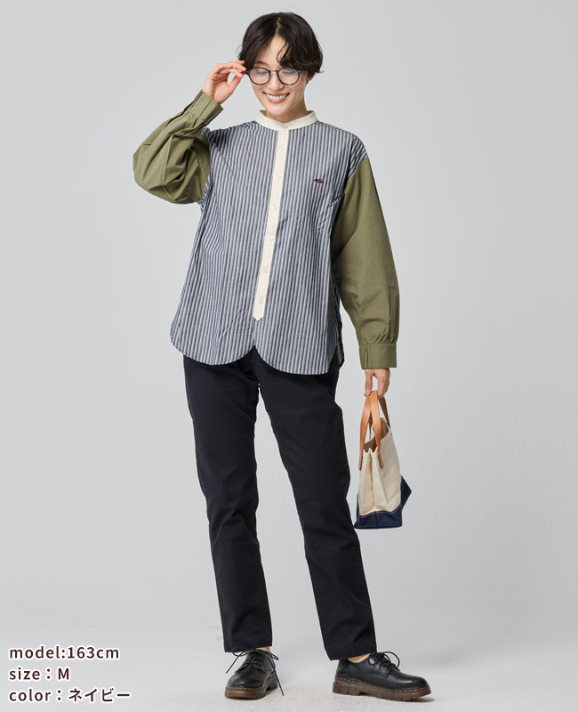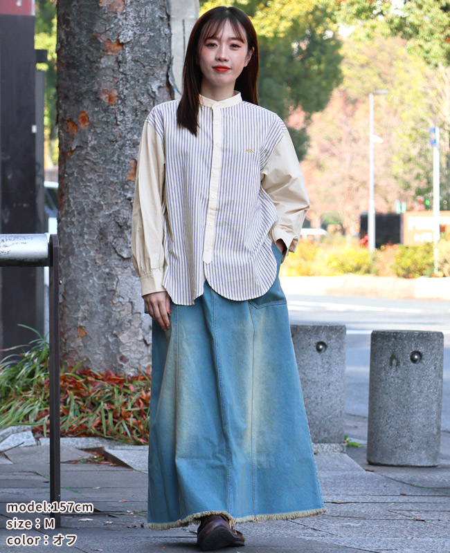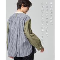 | 《KRIFF MAYER 春アイテム「異素材ミックスストライプシャツ」》 綿100%で優しい肌触りのストライプシャツをカジュアルにクリフメイヤーらしくアレンジ。 袖にもコットン異素材を用いて、着心地の良さは崩さず、でも真面目すぎない大人の余裕を醸し出す欲張りな1着に仕上げました。 シャツのキチンと感はそのままに、ノーカラーでリラックスを纏う軽やかな首元の抜け感を演出。 単調にならず、ぱっと華やかになるマルチストライプを採用し、アクセいらずの存在感で1枚でサマになる主役級シャツに。 お尻まで隠れる安心丈に裾ラウンドデザインで、さらっと羽織って美しく体型カバーまで。 袖口には半分ゴムを入れ、腕まくりも簡単で実用性も兼ね備えました。 後ろにはたっぷりのギャザーを加え、カラーはあえて落ち着いた色味を選定することで 甘すぎず、地味すぎないキレカジな大人バランスに。幅広い年齢層に『ちょうどいい』1枚になっています。 | |||||||||||||||||||||||||||