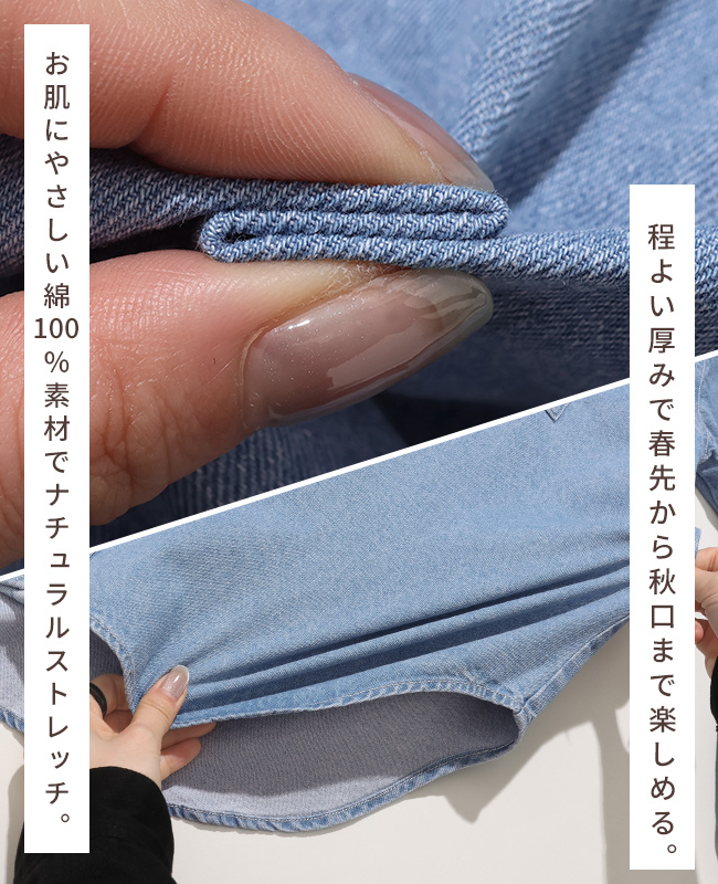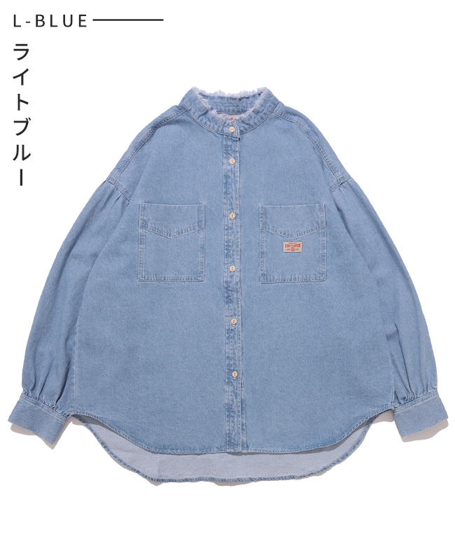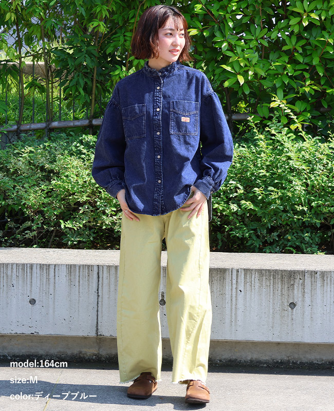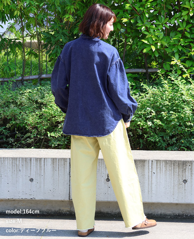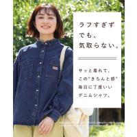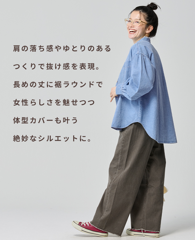 | 《KRIFF MAYER 春アイテム「カットオフバンドカラーデニムシャツ」》 程よい厚みの8オンスデニムを使用し、 自然な色落ちと洗い加工で、着慣れたような風合いに仕上げました! ラフすぎず、でも気取らない、ちょうどいい一枚です♪ アームホールにはギャザーを施し、女性らしいやわらかさを演出。 ゆとりのある身幅は体型を優しくカバーし、リラックスした着心地に! 襟元の切りっぱなし風フリンジがベーシックな中に少しだけ遊び心をプラス。 デニムなのに重く見えず、さらっと羽織るだけで雰囲気が出ます! パンツにもスカートにも合わせやすく着回し力も◎ 気軽に着られて、毎日にちょうどいいデニムシャツです! ※インディゴ染めの染料は色落ちしやすい性質を持ちます。 着用・洗濯を繰り返すことにより、少しずつ変化する表情や風合いを楽しむことができます。 その為摩擦や濡れたままでの放置により移染する場合がございます。 取り扱いの際は付属のコーションタグをよくご確認くださいませ。 | ||||||||||||||||||||||||||||||||||||||