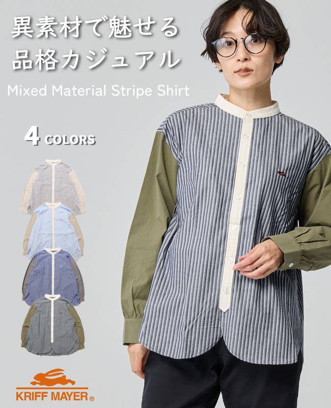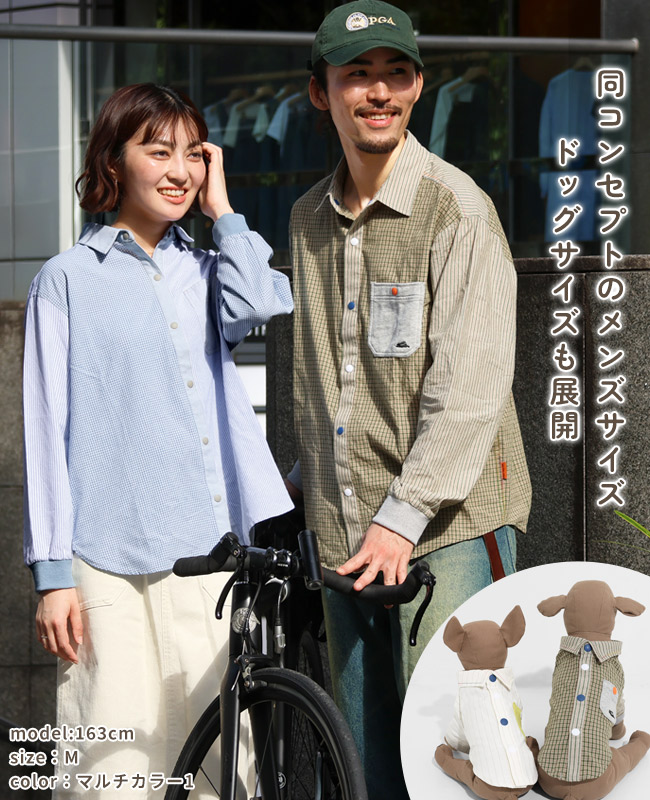 | 《KRIFF MAYER 春アイテム「袖リブハッピーシャツ」》 スナップボタンに袖リブが特徴のハッピーシャツが今年も登場。 袖口のリブは袖が捲りやすく、水場や暑さに合わせて調節できお出かけ中だけでなく家の中でもストレスフリーで便利な仕様です。 スナップボタンなのでボタンかけの手間がなく、急いでいる朝や、羽織りものとして使いたい時にも最適。 広すぎない程よい肩幅と、深めのスリット、丸みのある裾で、腰周りをカバーしつつ、重くなりすぎないスッキリとしたデザイン。 見た目もポップで、着心地も良く、体型カバーも叶うハッピーなシャツに仕上げました。 【無地ベース】オフ・ピンク「さりげない個性が光る、大人のデイリーウェア」 オフ: 清潔感のある真っ白すぎないアイボリーを基調に、襟や前立て、ポケット、そして背中のヨーク部分に淡いグリーンのストライプを配置。顔まわりに縦ラインが入ることで、スッキリと明るい印象を与えます。 ピンク: 柔らかなピンクに、ベージュのストライプをミックス。甘くなりすぎないニュアンスカラーの組み合わせで、肌馴染みの良さと上品さを両立しています。 【柄ベース】サックス(ストライプ)・ネイビー(ギンガムチェック)「王道スタイルを、モダンにアップデート」 サックス: 全体の爽やかなストライプを、アイボリーの襟や袖リブで引き締め。パジャマっぽくなりがちな総柄シャツに、無地のパーツが「きちんと感」をプラスしています。 ネイビー: 落ち着いたギンガムチェックに、濃紺の無地をヨークや前立てに使用。ダークトーンの無地で切り替えることで、全体のボリュームをギュッと引き締め、都会的でクールな印象に仕上げています。 【マルチカラー】マルチ1・マルチ2「360度、どの角度も主役級のデザイン」 マルチカラー1: ギンガム、ストライプ、無地をブルー系でミックス。左右の身頃や袖でパターンが異なるため、歩くたびに表情が変わります。 マルチカラー2: 柔らかなイエローの無地とストライプを大胆に構成。見頃のアシンメトリーなデザインが遊び心たっぷりで、着るだけで気分を明るくしてくれます。 こちらのアイテムは同素材・同コンセプトのメンズサイズ(品番:2536301)ドッグサイズ(品番:D2536320)がございますのでお揃い・ペアルック・リンクコーデがお楽しみいただけます。 | ||||||||||||||||||||||||||||||||