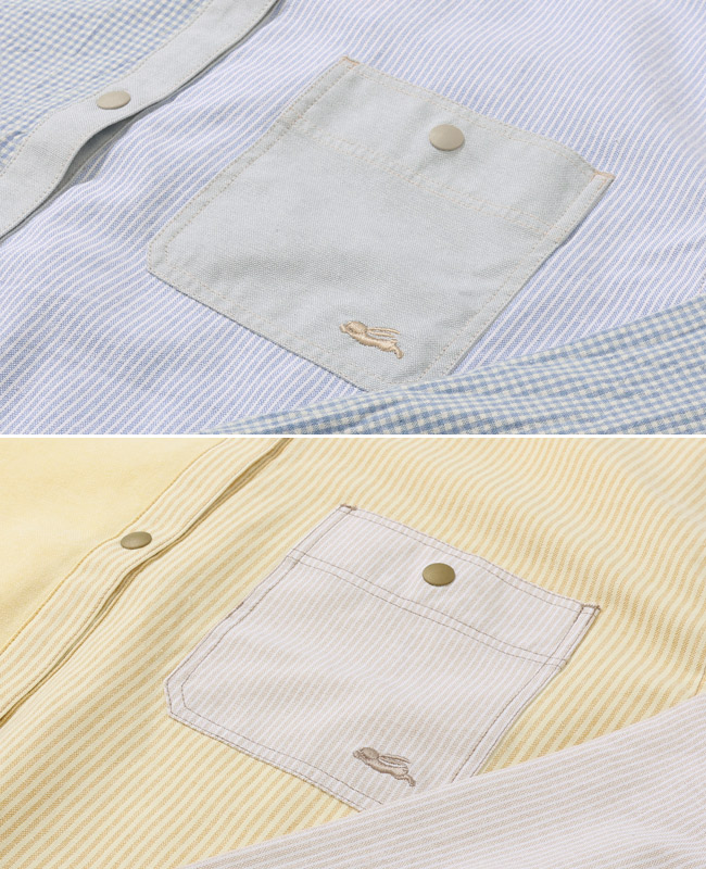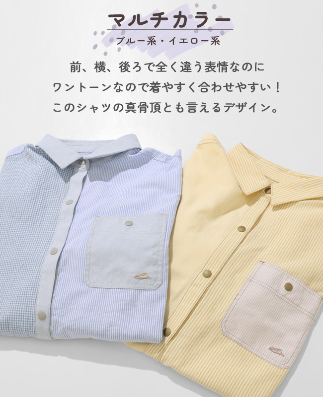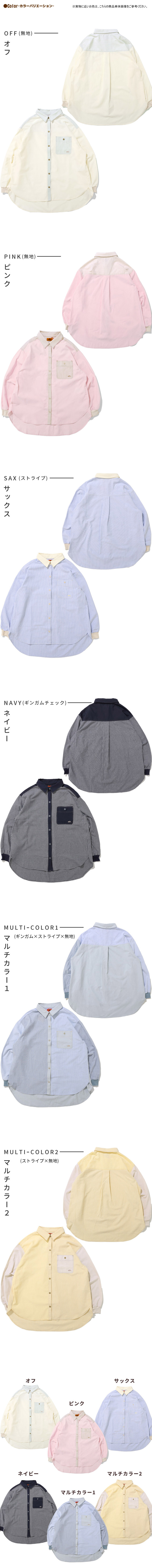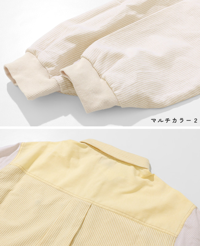 | ■中国製■ [オフ/ピンク] 【無地】綿59% ポリエステル41% 【ストライプ部分】綿60% ポリエステル40% [サックス] 【ストライプ】綿60% ポリエステル40% 【襟部分】綿59% ポリエステル41% [ネイビー] 【チェック】綿38% ポリエステル29% レーヨン27% 再生繊維(セルロース)6% 【無地部分】綿59% ポリエステル41% [マルチカラー1] 【ストライプ(左前身頃/ヨーク)】綿60% ポリエステル40% 【ストライプ(右袖)】綿58% ポリエステル42% 【チェック】綿38% ポリエステル29% レーヨン27% 再生繊維(セルロース)6% 【無地】綿59% ポリエステル41% [マルチカラー2] 【ストライプ(襟/左見頃/後ろ)】綿58% ポリエステル42% 【ストライプ(ポケット/袖)】綿60% ポリエステル40% 【無地】綿59% ポリエステル41% 【リブ部分(全カラー共通)】綿72% ポリエステル26% ポリウレタン2% | ||||||||||||||||||||||||||||||||