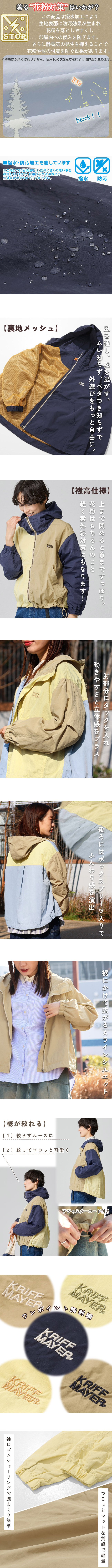 | 《KRIFF MAYER 春アイテム「花粉ドロップフードJK」》 花粉の季節もなるべく負担なく過ごしてほしい! そんな想いで作られた春先のアウトドアや街歩きでも安心して楽しめる花粉防止ジャケットの登場。 静電気・花粉防止・撥水防汚がついた機能性の高いアウトドアに最適な自信作です。 花粉だけでなく、静電気で付着しやすい細かいゴミまで付きにくくします。 やや短丈で前立てなしのすっきりとしたベーシックデザインに 身幅はややワイドのゆったりとしたデザインでバランスをとった一枚。 肘部分にはタックを施し、動きやすさと立体感をプラスしているので 一見シンプルに見えますが、着ると程よく個性をだせるアイテムです。 裾にかけて広がるAラインシルエットが体型カバーも叶え、同時に女性らしさも演出。 裏地はメッシュになっており通気性も高く、ロングシーズンお使いいただけます。 こちらのアイテムは、同コンセプトのメンズアイテム(品番:2537805)とドッグアイテム(品番:D2537845)も展開しておりますので 花粉がつらい季節に、愛犬とのお散歩など家族で着用できるアイテムです。 ■CLEANNESS(クリーネス) この商品は、撥水・防汚加工を施した商品です。 完全防水ではないので、強い雨等に長時間あたると水分が浸透します。 内側からの湿気も通すので、ムレにくい特性を持ちます。 ※撥水/防汚加工は永久ではありません。 工場にて30回洗濯後に、効果に変わり無い事を確認していますが、使用状況や洗濯方法で個体差が出ますのでご了承下さい。 | ||||||||||||||||||||||||||||||||