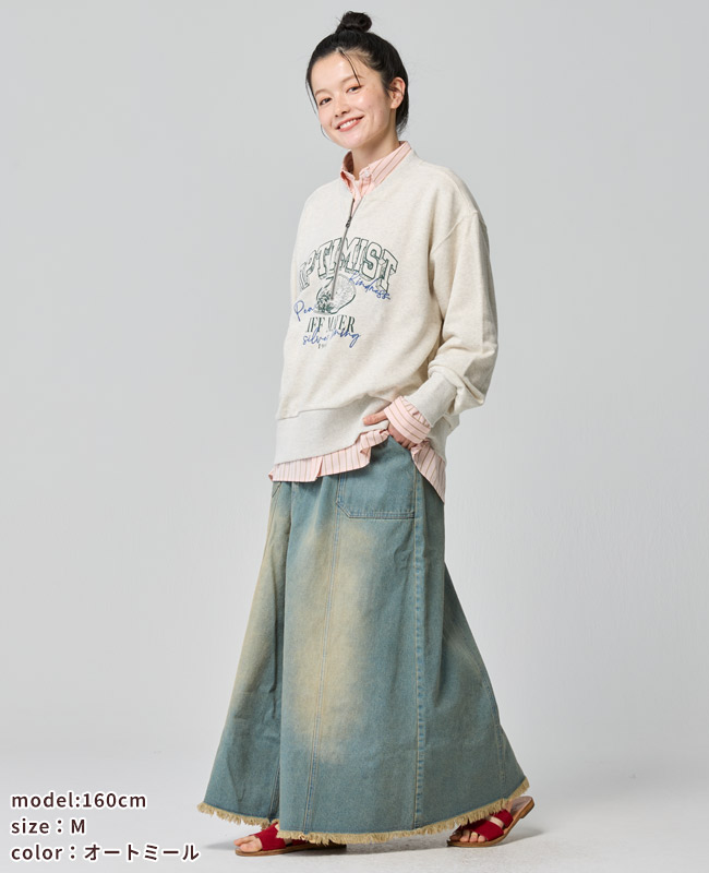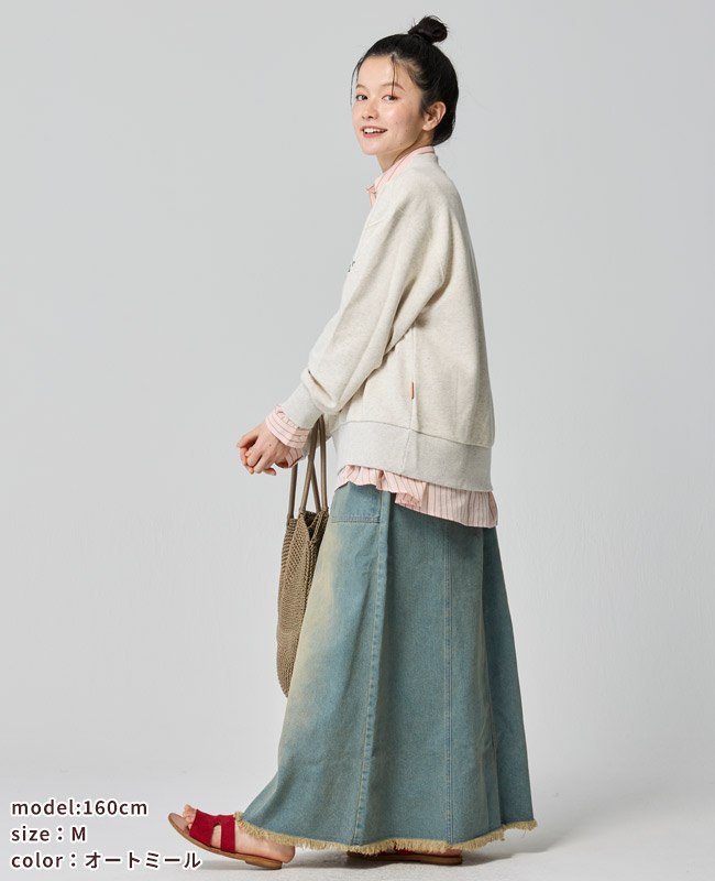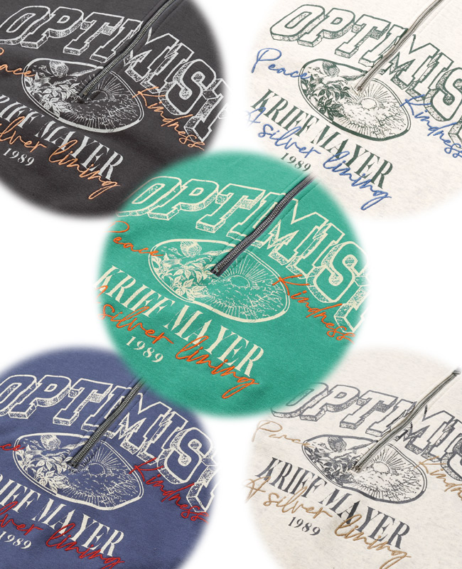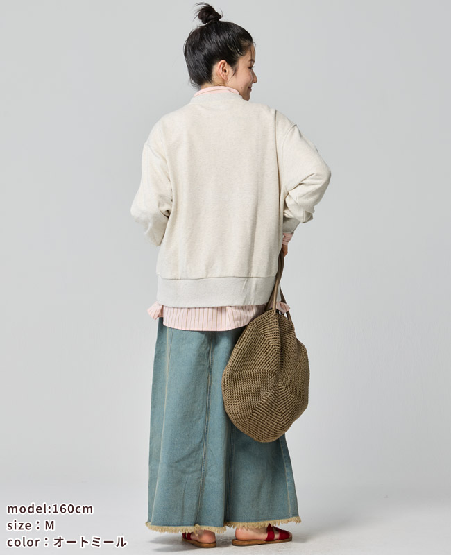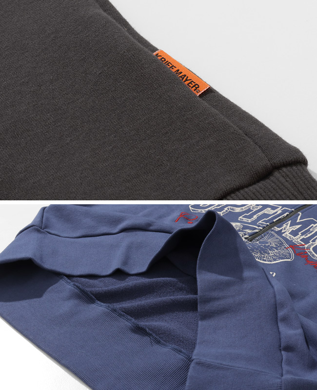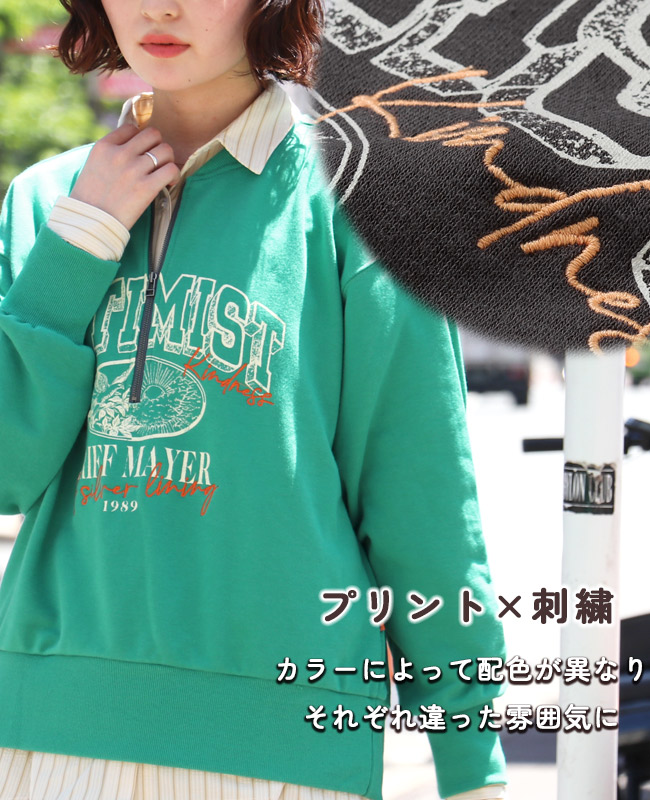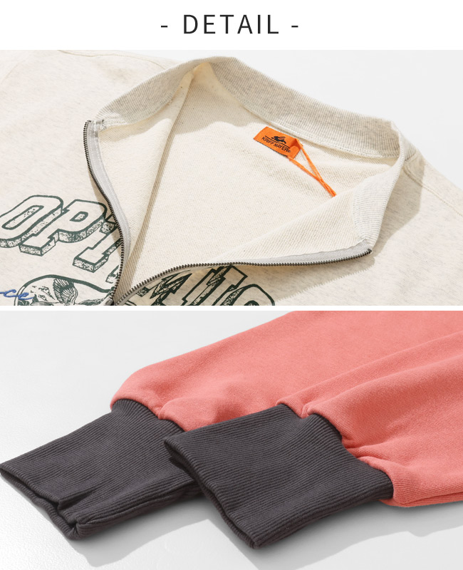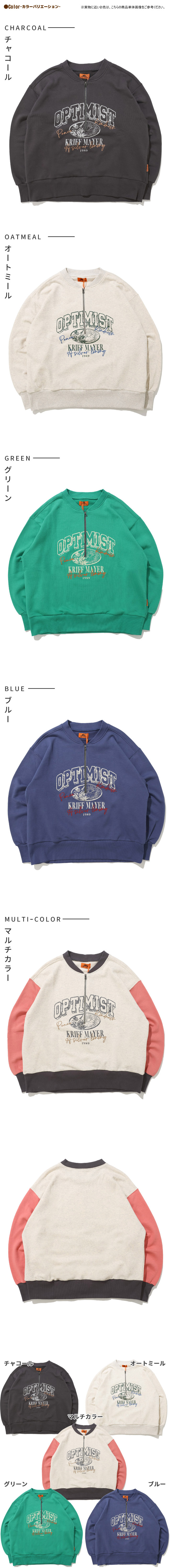 | 《KRIFF MAYER 春アイテム「のび~る裏毛ハーフZIPスウェット」》 伸縮性が高く動きやすいストレッチ裏毛素材を使った【のび〜る裏毛】シリーズ。 Tシャツ以上の程よい生地厚で、季節の変わり目に最適なミニ裏毛。 重ね着が楽しくなる!プリントと刺繍が組み合わさったハーフジップスウェットの登場です。 ファスナーを閉めても開けても可愛く決まるので、その日の気分やコーデに合わせて楽しめます。 身幅はややゆったりめのリラックスしたシルエットで ファスナーをあけて重ね着をする際に、もたつかないように設定しています。 体のラインを拾わず、気になる部分はしっかりカバー。 野暮ったくならない絶妙なサイズ感に拘りました。 袖や裾のリブを太めにしているので、キュッとメリハリがつき 柔らかいミニ裏毛生地が袖にたまる感じが、ゆるっと可愛いポイント。 カジュアルに、でもちょっと人と違うおしゃれを楽しみたい方におすすめの一枚です。 | |||||||||||||||||||||||||||