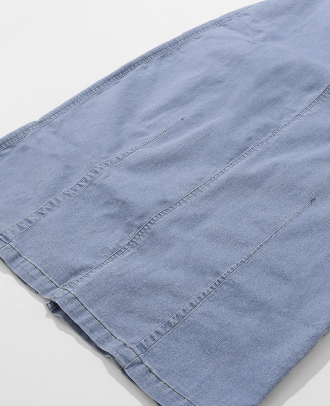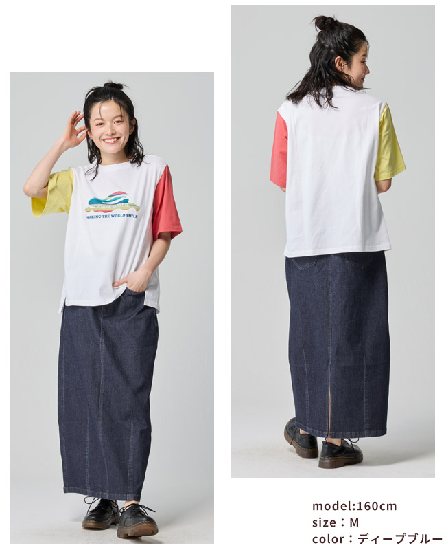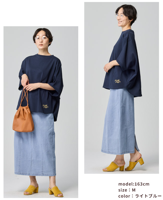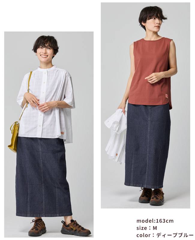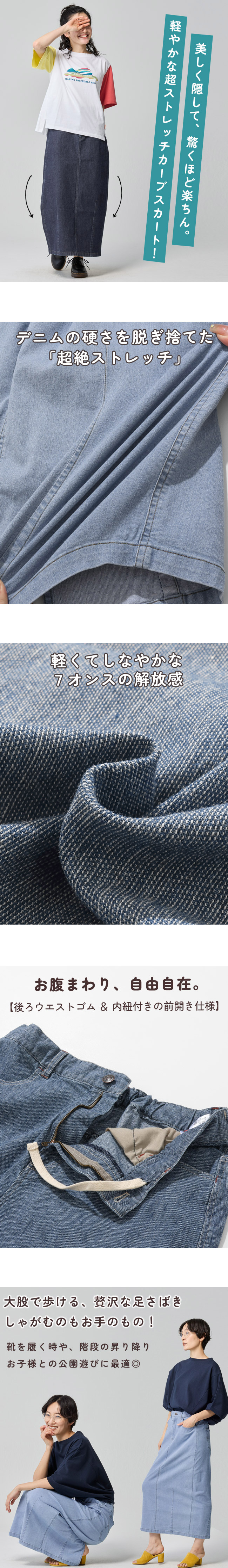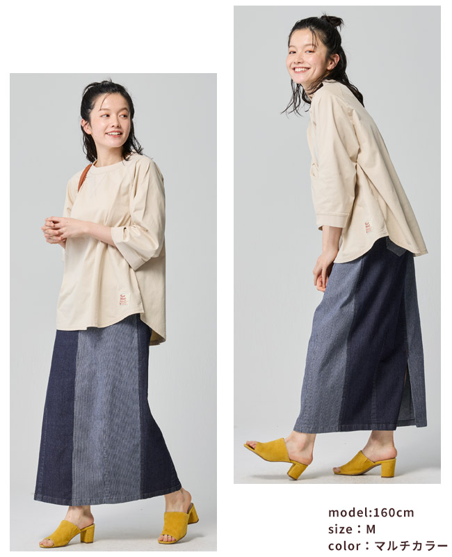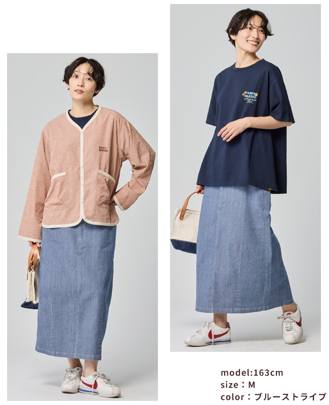 | 《KRIFF MAYER 夏アイテム「ストレッチデニムカーブスカート」》 \美シルエットと驚きの動きやすさ!夏に穿きたい「理想のデニムスカート」/ KRIFF MAYERから、トレンドのカーブシルエットを取り入れた新作デニムスカートが登場! 「デニムは重い・暑い・動きにくい」という常識を覆す、夏にぴったりの万能アイテムです。 ■ ここがポイント! ・「カーブシルエット」で体型カバー 絶妙な丸みを持たせたシルエットが、気になるお尻や太もものラインを自然に隠してくれます。 裾に向かって緩やかに細くなるラインで、ゆったりなのにスッキリ見えが叶います。 ・驚くほどの「超絶ストレッチ」 非常に伸縮性のあるデニム生地を採用。 タイトなスカートにありがちな窮屈感がなく、しゃがむ・走るなどのアクティブな動きもノンストレス。キャンプや公園遊び、自転車移動にも最適です。 ・夏でも涼しい「7oz(オンス)」の軽量デニム 一般的なジーンズよりもやや薄手で軽い7オンス生地を使用。 通気性が良く、ベタつく夏場でもサラッと軽やかに穿きこなせます。 ・大人カジュアルな「4つのバリエーション」 定番のブルー系から、一癖あるマルチカラーやストライプまで。 どれもクリフメイヤーらしいヴィンテージ感漂う風合いに仕上げました。 ■ カラーバリエーション ディープブルー: 引き締め効果抜群!きれいめにも使える深みのあるインディゴ。 ライトブルー: 夏の陽差しに映える、爽やかで清涼感のあるウォッシュカラー。 ブルーストライプ:【もはや無地見え!?究極の繊細ストライプ】 カラー名は「ストライプ」ですが、一般的な縞模様とは異なり、白糸を細かく織り込んだシャンブレーのような繊細な表情が特徴です。 遠目にはニュアンスのあるブルー無地に見え、間近で見るとごく細かな織り模様が浮かび上がります。 単色のブルーよりも奥行きがあり、コーディネートに馴染みやすい柔らかな色合いが特徴で大人のカジュアルスタイルに最適な、奥行きのある表情が魅力です。 マルチカラー:【アクセントを効かせた、アメカジらしいストライプピッチ×ディープブルー無地】 クレイジーパターンを引き立てるよう、ブルーストライプよりも「少し広め」のピッチを採用。左右で異なるデニム地とのコントラストが美しく、パッと目を惹くポップな世界観を作ります。 ※インディゴ染めの染料は色落ちしやすい性質を持ちます。 着用・洗濯を繰り返すことにより、少しずつ変化する表情や風合いを楽しむことができます。 その為摩擦や濡れたままでの放置により移染する場合がございます。 取り扱いの際は付属のコーションタグをよくご確認くださいませ。 | |||||||||||||||||||||||||||