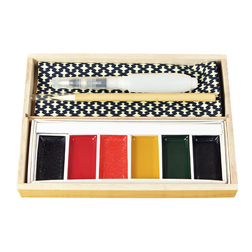 セット内容・桐ケース・顔彩6色・水筆ペン1・彩色筆1・絵具ふき取り布1
