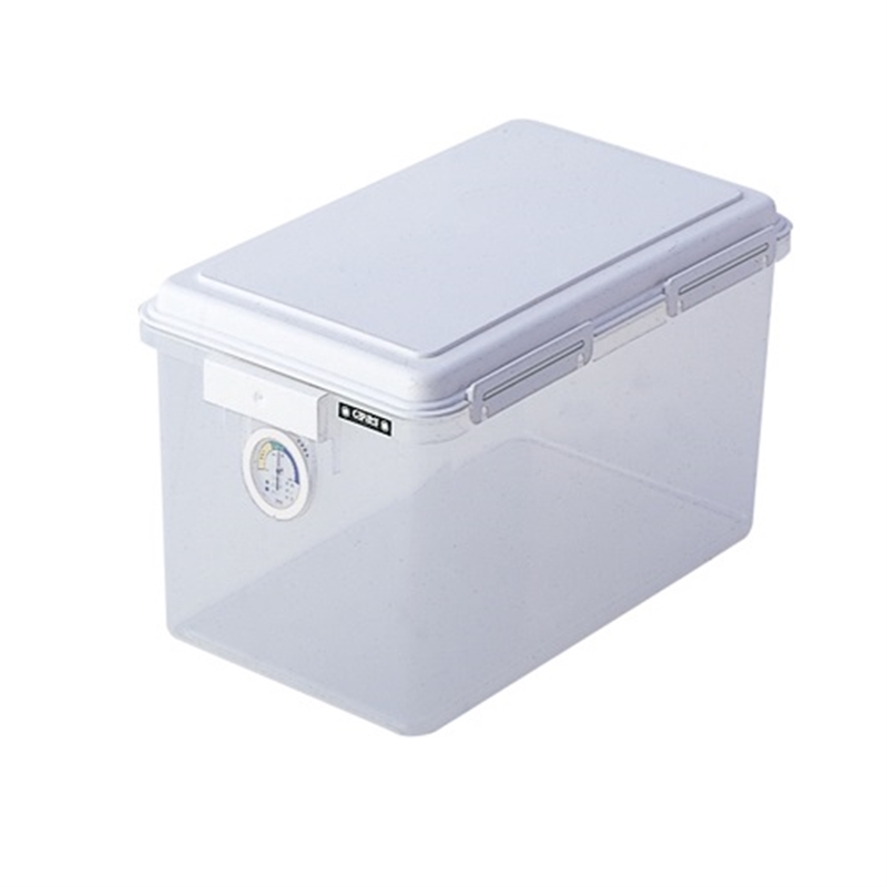 密封機能と、中の湿度がわかる湿度計のついた、樹脂(プラスチック)収納フタの周囲はシリコンゴムを使った密閉方式。
