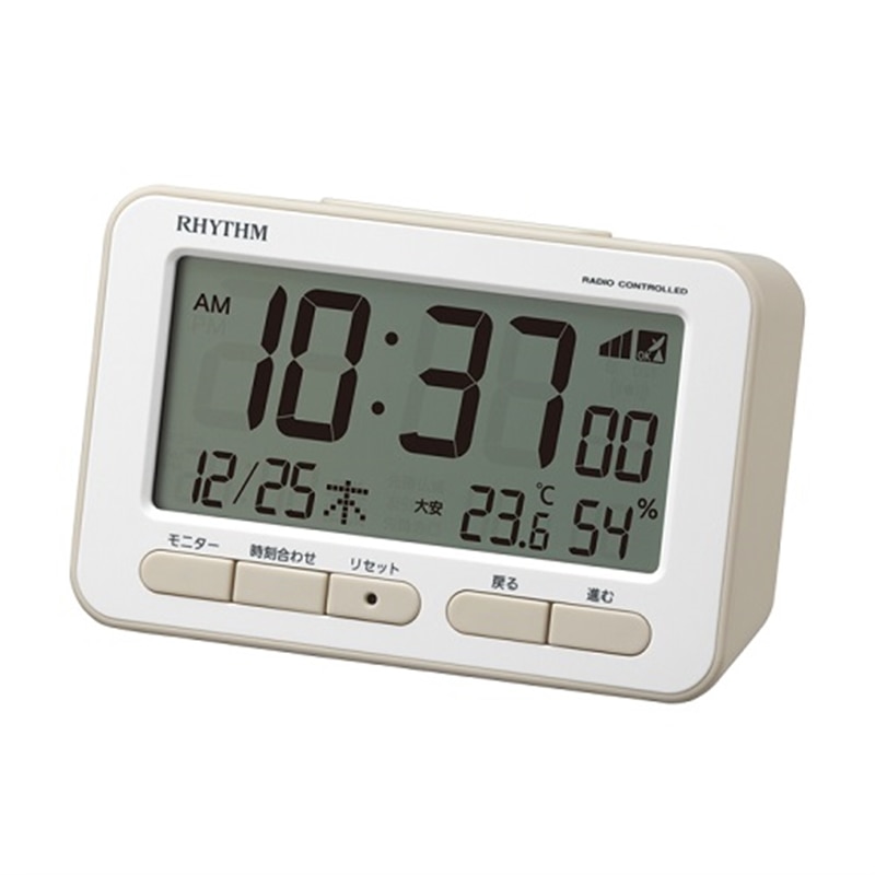 柔らかいフォルムの電波デジタル時計見やすい大きめのLCD(液晶)と柔らかいフォルムが特徴の電波デジタルめざまし時計です。