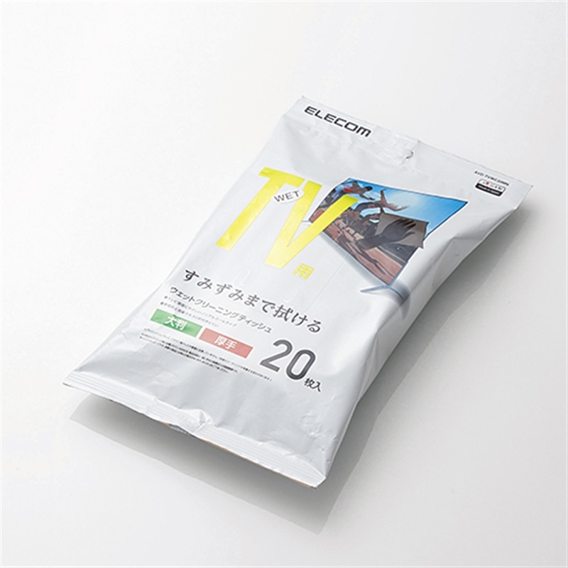 TV画面のお掃除に安心のノンアルコールタイプ!ウエットクリーニングティッシュ液晶テレビの画面をお手入れするのに最適なウェットクリーニングティッシュです。画面に付いたホコリや指紋などの汚れを、力を入れずにやさしく拭き取るだけでしっかりと除去できますので、液晶テレビの画面を傷めず、安心してお手入れができます。さらにノンアルコールタイプなので、画面への刺激が少なく、表面にコーティングがしてあるようなデリケートなテレビ画面でも安心して使用できます。また、水滴による拭き跡が残りにくく、画面をクリアに仕上げることができます。