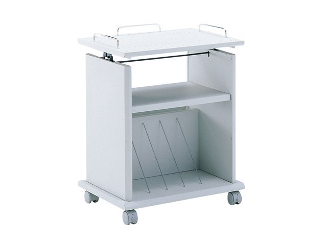 ●簡単なレバー操作で、上下に高さ調節が可能なプロジェクター台です。 ●天板にはプロジェクターの落下予防のためのガード付きです。 ●中棚には、ビデオデッキやDVDプレイヤーなどのAV機器を設置できます。 ●A4サイズのファイル、マニュアルなどが収納できます。 ●ケーブル収納用ガイド付きです。ケーブルやOAタップを収納できます。 ●リモコンなどの小物が置けるホルダー付きです。