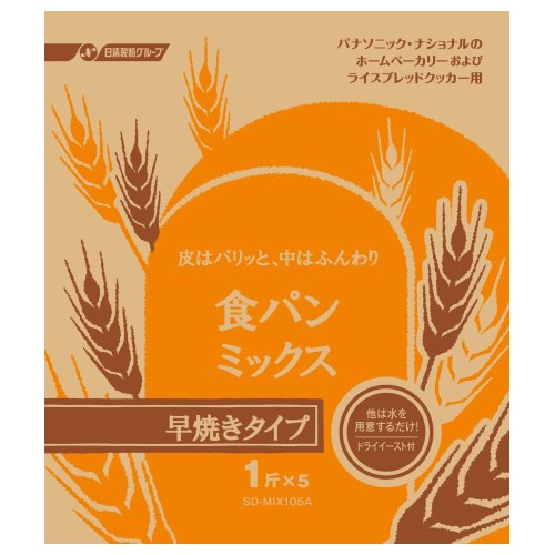ナショナル・パナソニックのホームベーカリー用のパンミックス。「早焼きコース」を塔載している機種専用になっていて、追加のドライイーストが付属しています。香ばしい焼き上がりのレギュラータイプで、あとは水を入れるだけで手軽にパンが焼けます。