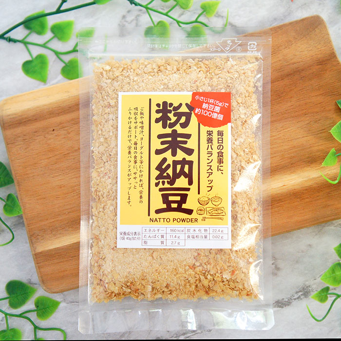 | 名称 | 乾燥納豆菌膜 | | 商品名 | 粉末納豆 | | 原材料 | 納豆(大豆(分別生産流通管理済み)、納豆菌)(国内製造) | | 内容量 | 40g | | 賞味期限 | 製品に記載(製造日より365日) | | 保存方法 | 直射日光・高温多湿を避けて常温で保存してください。 | | コメント | あの健康食材・納豆が、使いやすい魔法のパウダーになりました! 手間なく栄養をプラスしたいあなたのための、「乾燥納豆パウダー」。 このパウダーの魅力は、なんといってもその納豆菌のチカラ! 小さじ1杯(5g)で、なんと約100億個もの納豆菌をギュッと凝縮しています。ご飯に,味噌汁に、ヨーグルトに。 いつもの食事にササッと振りかけるだけ!粘りや匂いが気にならず、手軽に豊富な納豆菌を摂ることができます。 毎日の食卓にこのパウダーをプラスして、無理なく栄養バランスをサポートし、イキイキとした毎日を送りませんか? | | どんな方にオススメ? | 妻 旦那 近所の友達 友人 主人 自分 父 母 祖父 祖母 叔父 叔母 義父 義母 お盆 お供え 息子 娘 孫 お年賀 お中元 お歳暮 バレンタイン 父の日 母の日 敬老の日 誕生日 バースデー用 プチギフトに | | サービス | メッセージカード利用可能 | | 在庫 | 即日〜1週間程度 | | 成分分析表示 100gあたり(推定値) | | エネルギー | 400kcal | | たんぱく質 | 28.5g | | 脂質 | 6.8g | | 炭水化物 | 56.2g | | 食塩相当量 | 0.062g |