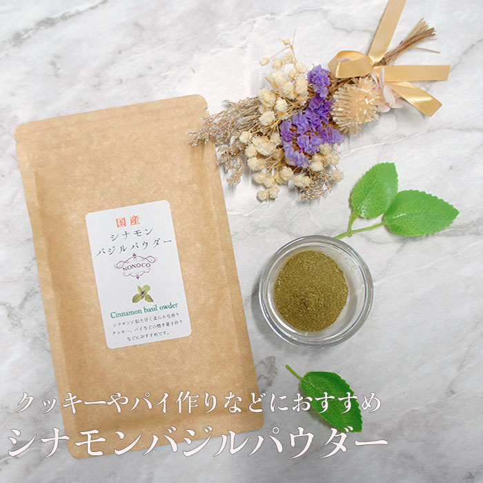 | 名称 | シナモンバジル粉末 | | 原材料 | バジル(国産) | | 内容量 | 40g | | 賞味期限 | 製品に記載(製造日より365日) | | 保存方法 | 直射日光・高温多湿を避けて常温で保存してください。 | | コメント | パウダー状のバジルです。クッキーやパイなどお菓子作りにおすすめです | | どんな方にオススメ? | 妻 旦那 近所の友達 友人 主人 自分 父 母 祖父 祖母 叔父 叔母 義父 義母 お盆 お供え 息子 娘 孫 お年賀 お中元 お歳暮 バレンタイン 父の日 母の日 敬老の日 誕生日 バースデー用 プチギフトに | | サービス | メッセージカード利用可能 | | 同梱 | 不可 | | 発送 | ゆうパケット(追跡番号あり・ポスト投函) | | 在庫 | 即日〜1週間程度 |