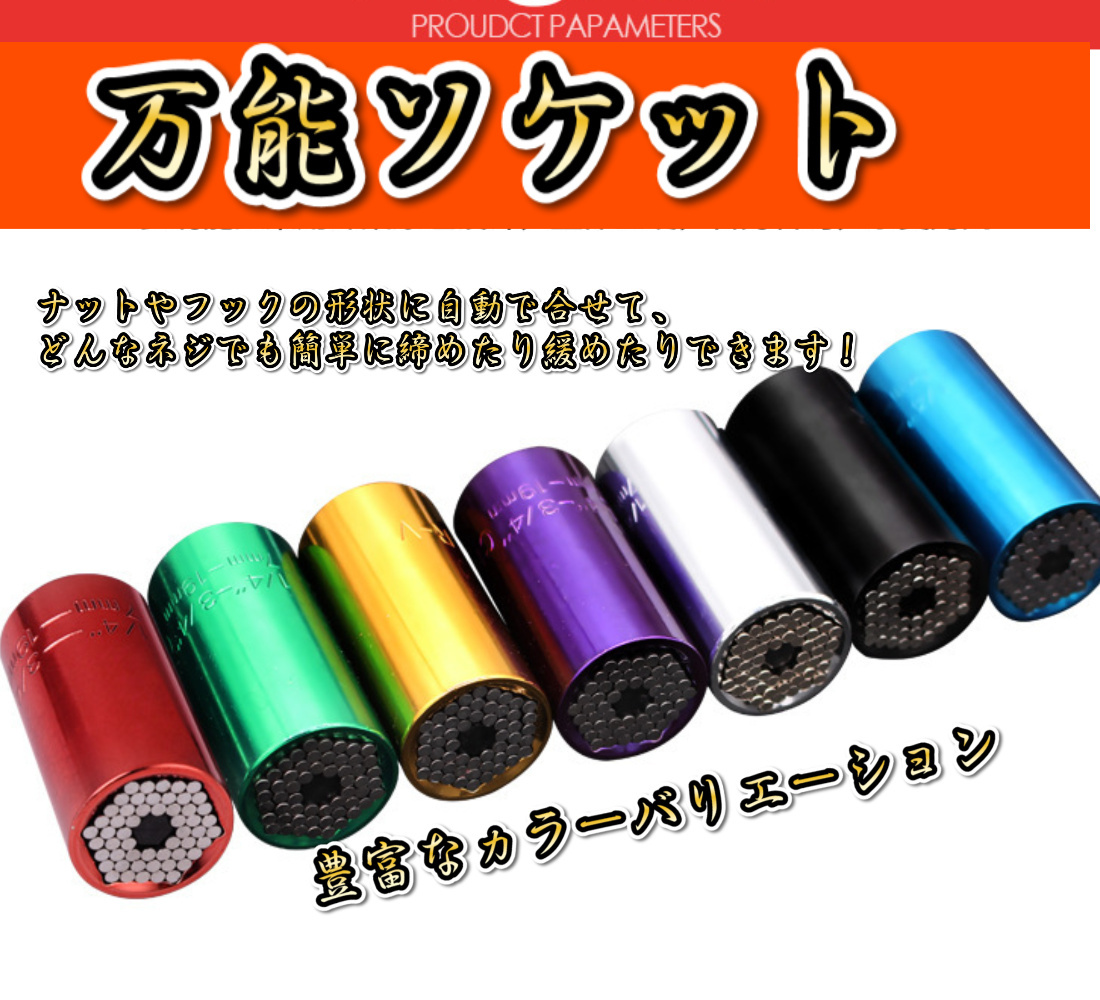【汎用性高-万能ソケット レンチ】自転車の修理から日曜大工までできる万能ソケット。コレ1本で、7-19mm口径のボルト?ナットなどに自由にサイズが変化する。ソケットアダプター付きなので電動ドライバー/インパクトドライバーでご利用可能。