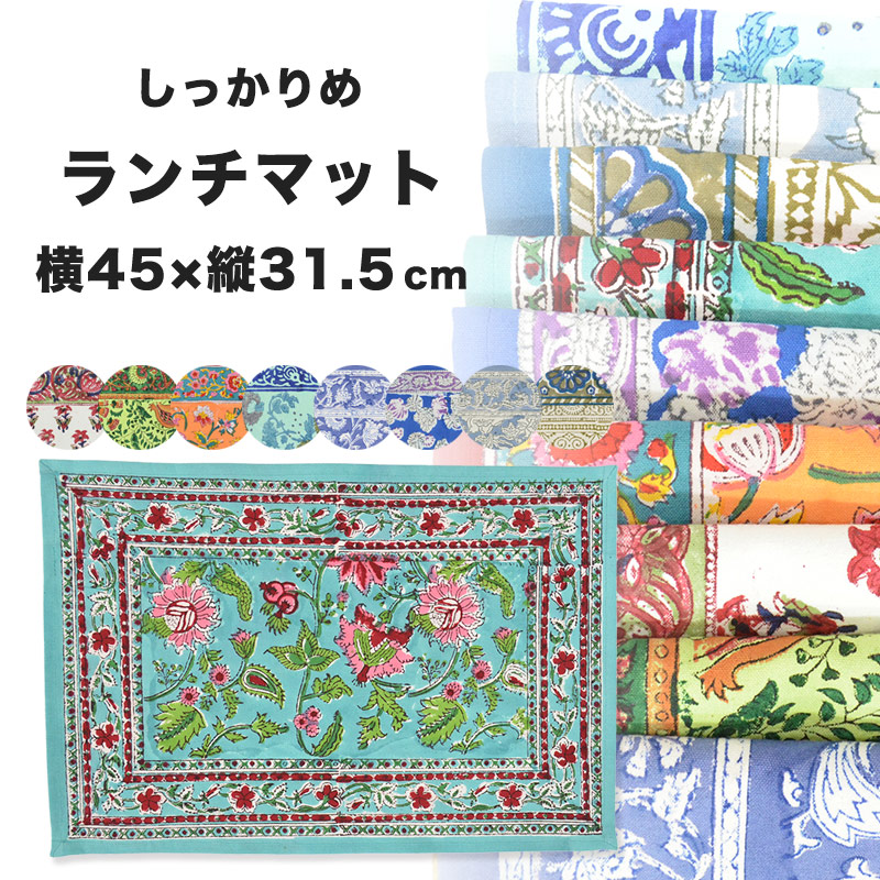 Anjuna エスニック柄 ランチマット インド綿 厚めのコットン100% 45cm×31.5cm 9パターン ランチョンマット/水洗いOK/ロックプリント/テーブル/カバー