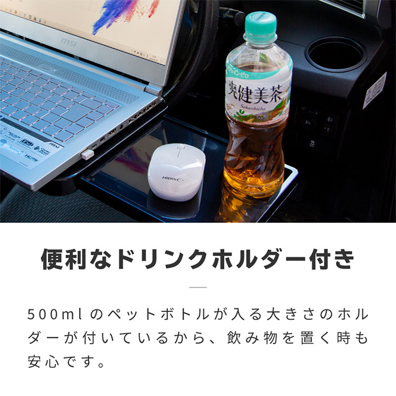 スライドテーブルを引き出して増設すれば、広々とした作業スペースとしてもご利用いただけます。 500mlのペットボトルが入る大きさのホルダーが付いているから、飲み物を置く時も安心です。