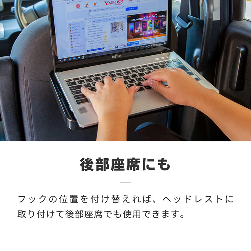 フックの位置を付け替えれば、ヘッドレストに取り付けて後部座席でも使用できます。