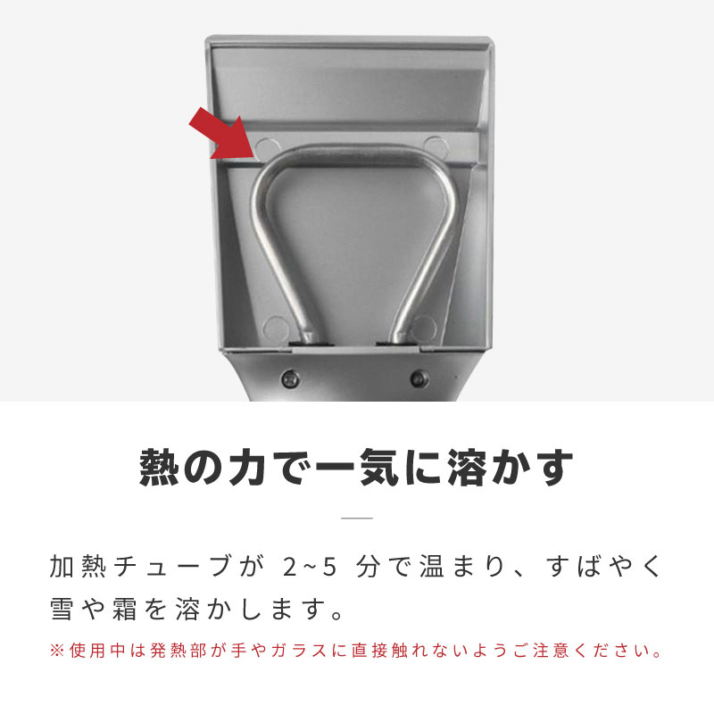 加熱チューブが2~5分で温まり、すばやく雪や霜を溶かします。