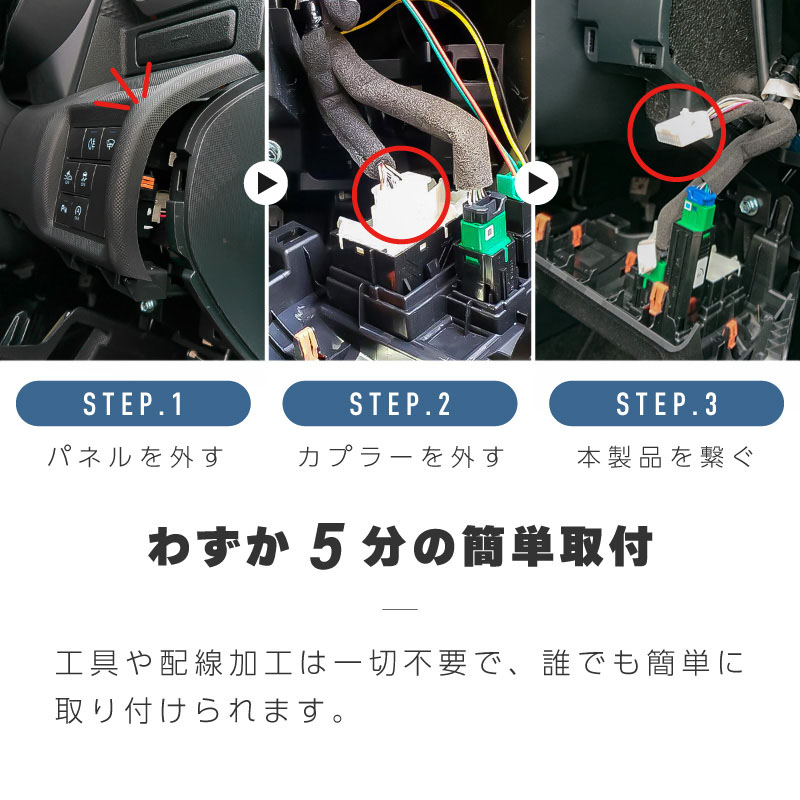 車体配線を傷つけることなく、誰でも簡単に取り付け可能です。