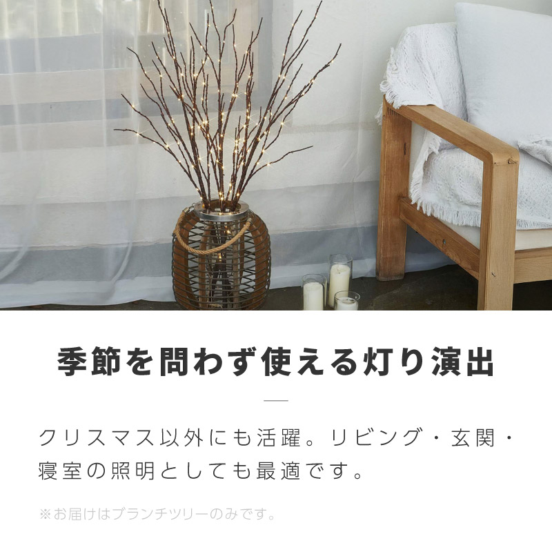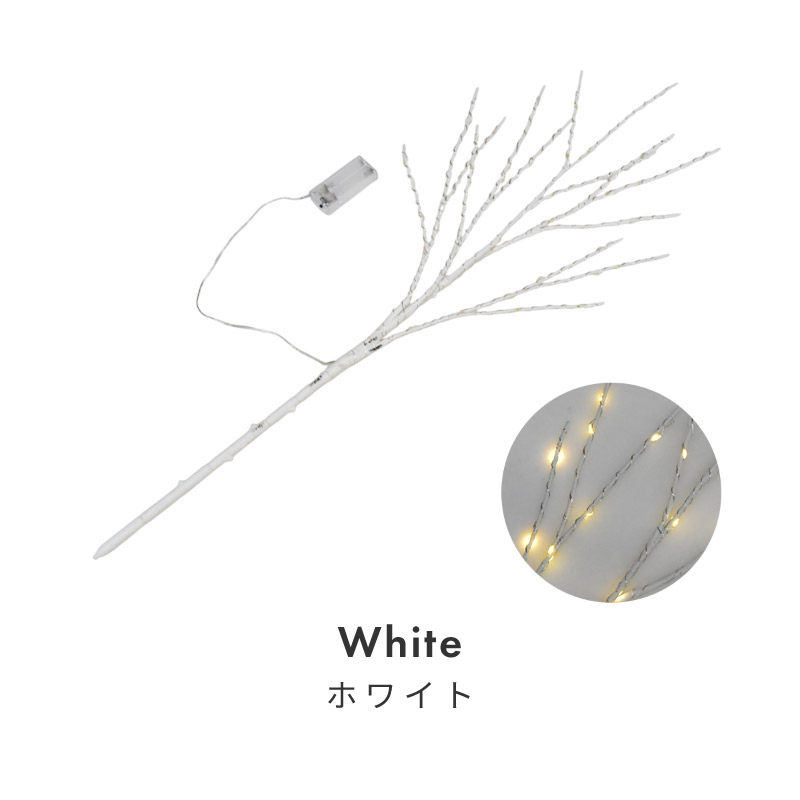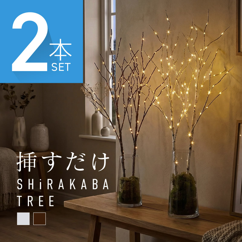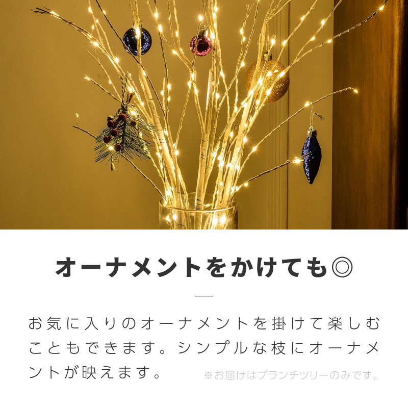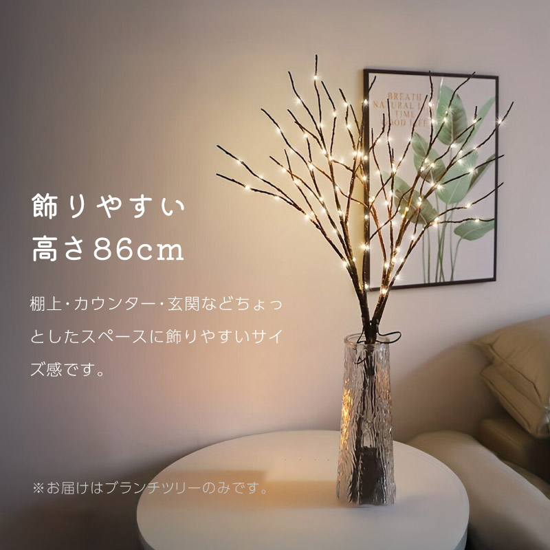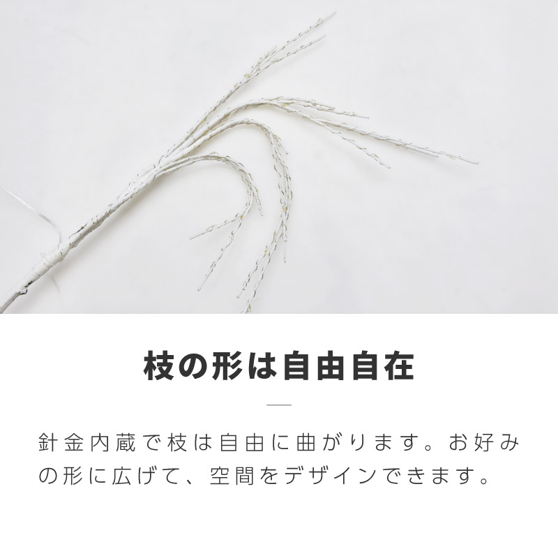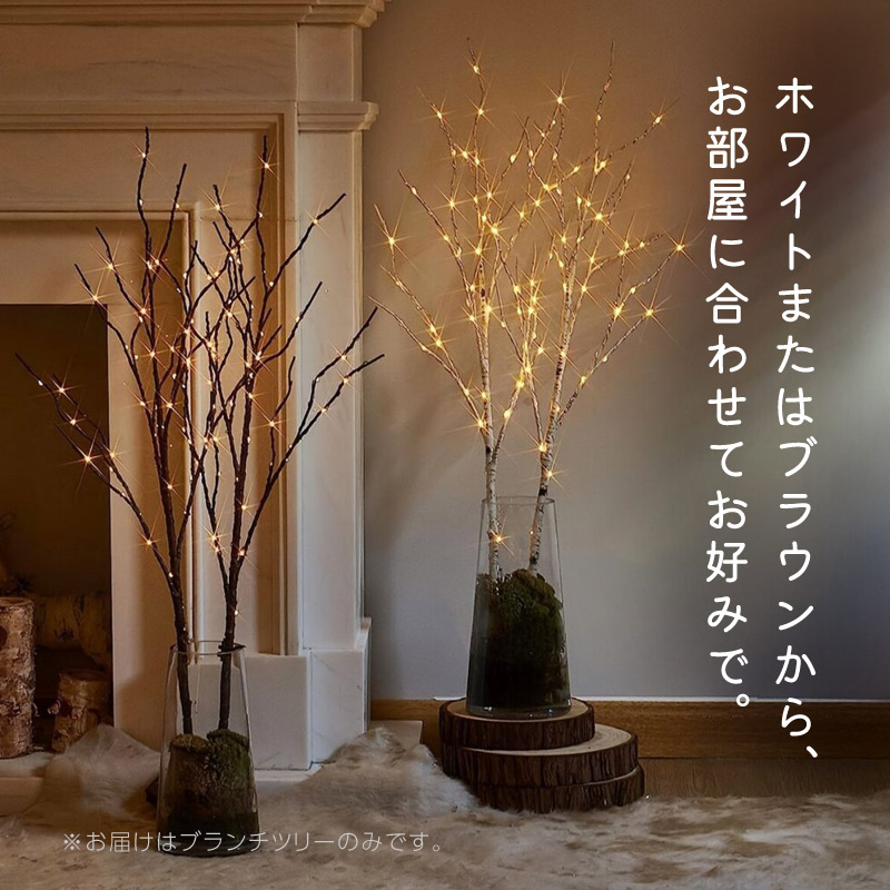 ブランチツリー クリスマスツリー LED 枝ツリー ヌードツリー 電池式 卓上 白樺 LEDツリー 86cm 北欧 イルミネーション ライト 照明 インテリア 電池式 ホワイト ブラウン 2本セットお部屋をやさしく彩る、LED付きブランチツリー(1本)の販売ページです。 高さ約86cmのスリムな枝ツリーは、棚や玄関、デスク上など省スペースにもぴったり。白樺風の枝にLEDライトが点灯し、ホワイト・ブラウンの2色から選べます。 乾電池式なのでコンセント不要。場所を選ばず手軽に設置できます。枝のみのシンプルなデザインは、オーナメントなしでも洗練された印象に。 もちろん、お気に入りの飾りを掛けて季節感を演出するのもおすすめです。クリスマスやハロウィンはもちろん、通年のインテリアライトとしても活躍。 花瓶や鉢に挿すだけで完成するので、組み立て不要で簡単に楽しめます。