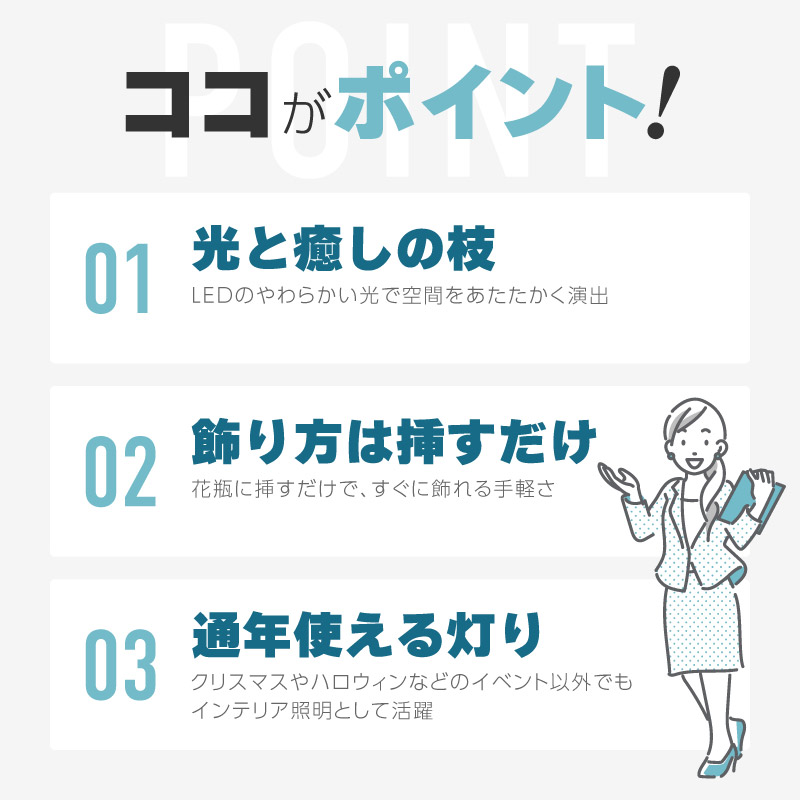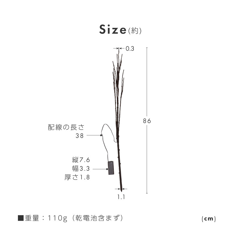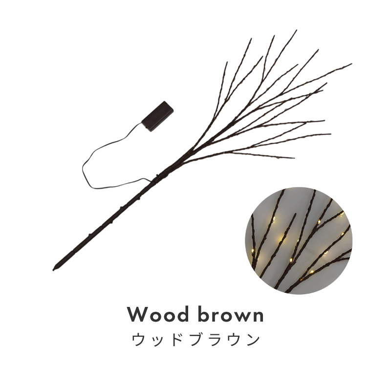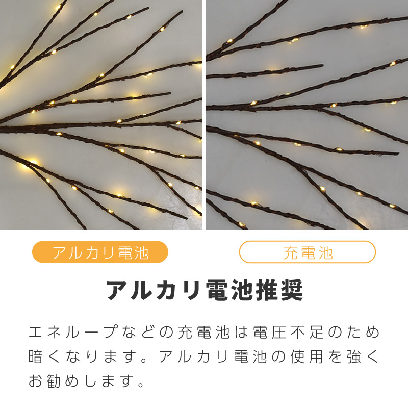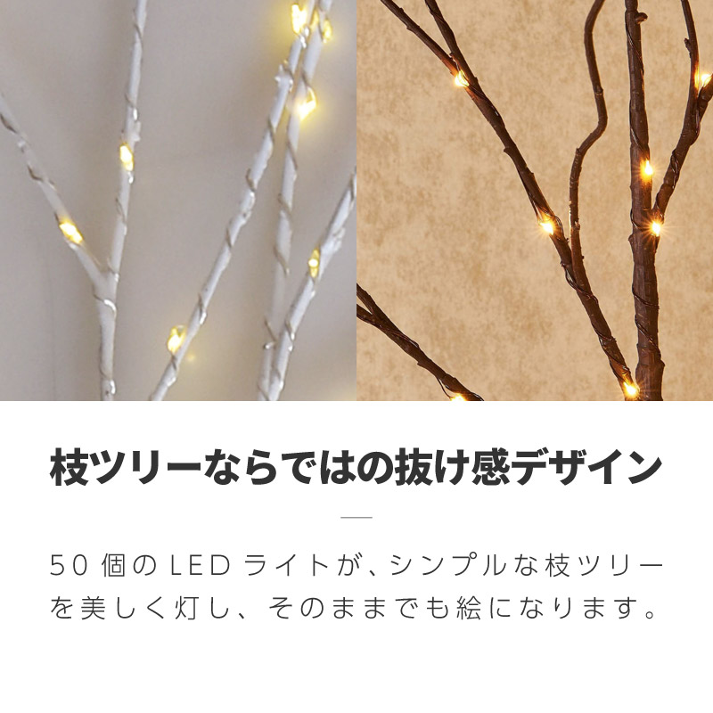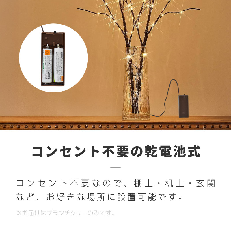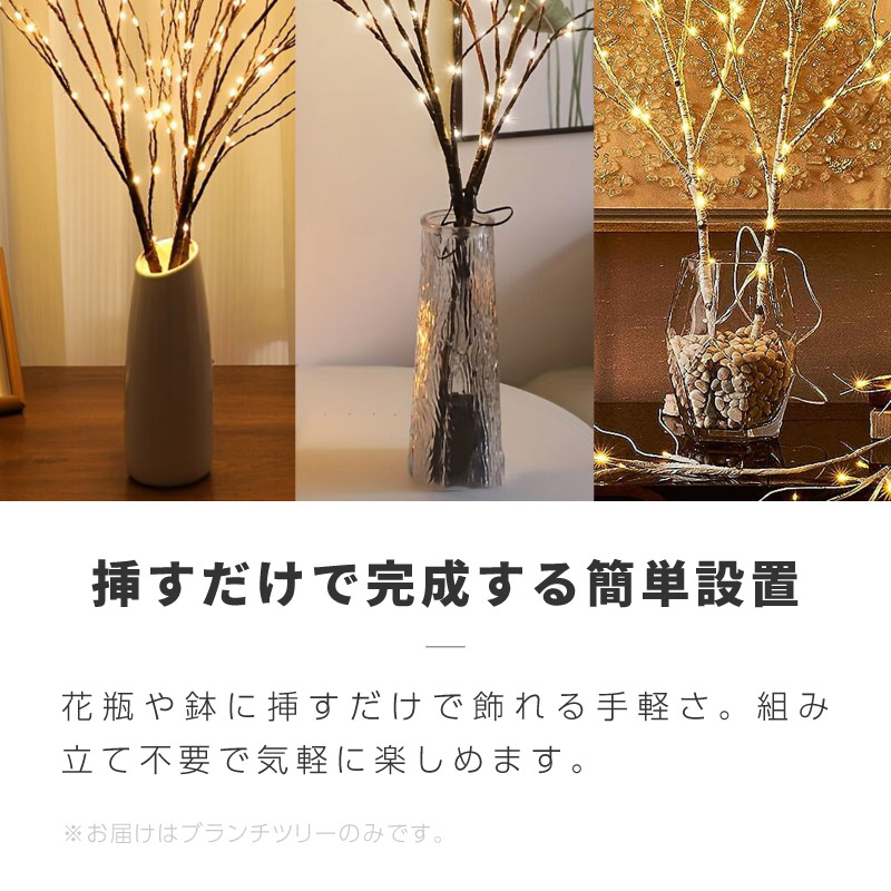 ブランチツリー クリスマスツリー LED 枝ツリー ヌードツリー 電池式 卓上 白樺 LEDツリー 86cm 北欧 イルミネーション ライト 照明 インテリア 電池式 ホワイト ブラウン 2本セットお部屋をやさしく彩る、LED付きブランチツリー(1本)の販売ページです。 高さ約86cmのスリムな枝ツリーは、棚や玄関、デスク上など省スペースにもぴったり。白樺風の枝にLEDライトが点灯し、ホワイト・ブラウンの2色から選べます。 乾電池式なのでコンセント不要。場所を選ばず手軽に設置できます。枝のみのシンプルなデザインは、オーナメントなしでも洗練された印象に。 もちろん、お気に入りの飾りを掛けて季節感を演出するのもおすすめです。クリスマスやハロウィンはもちろん、通年のインテリアライトとしても活躍。 花瓶や鉢に挿すだけで完成するので、組み立て不要で簡単に楽しめます。
