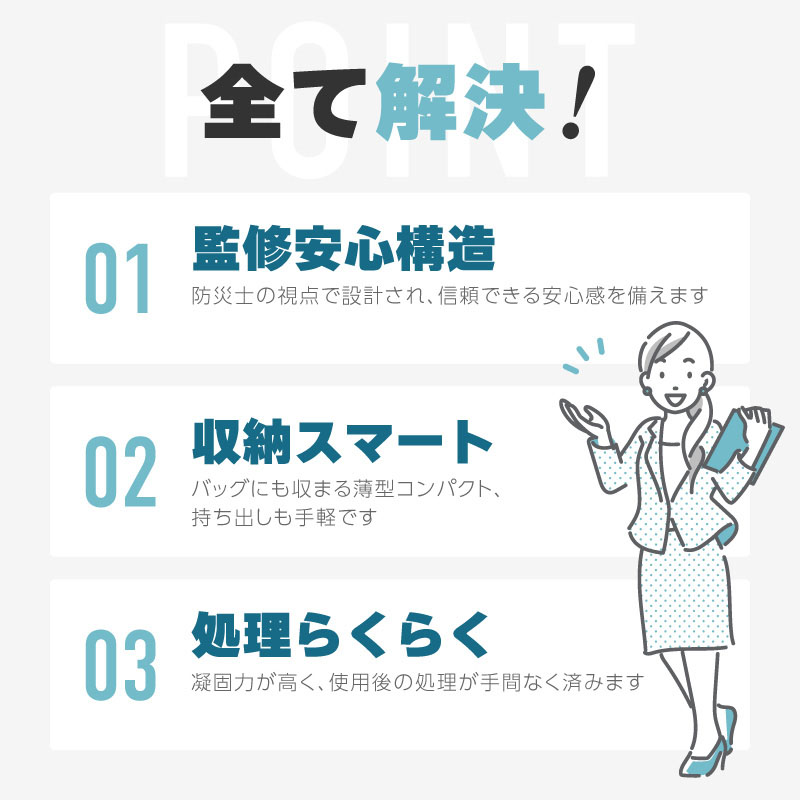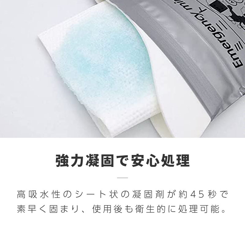高吸水性のシート状の凝固剤が約45秒で素早く固まり、使用後も衛生的に処理可能。