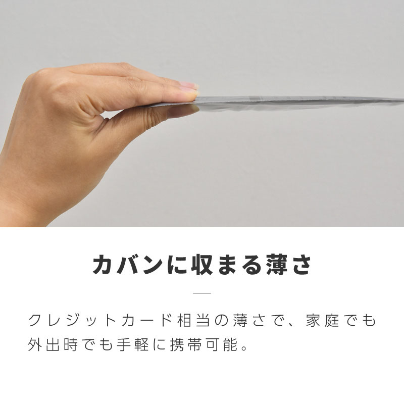 クレジットカード相当の薄さで、家庭でも外出時でも手軽に携帯可能。