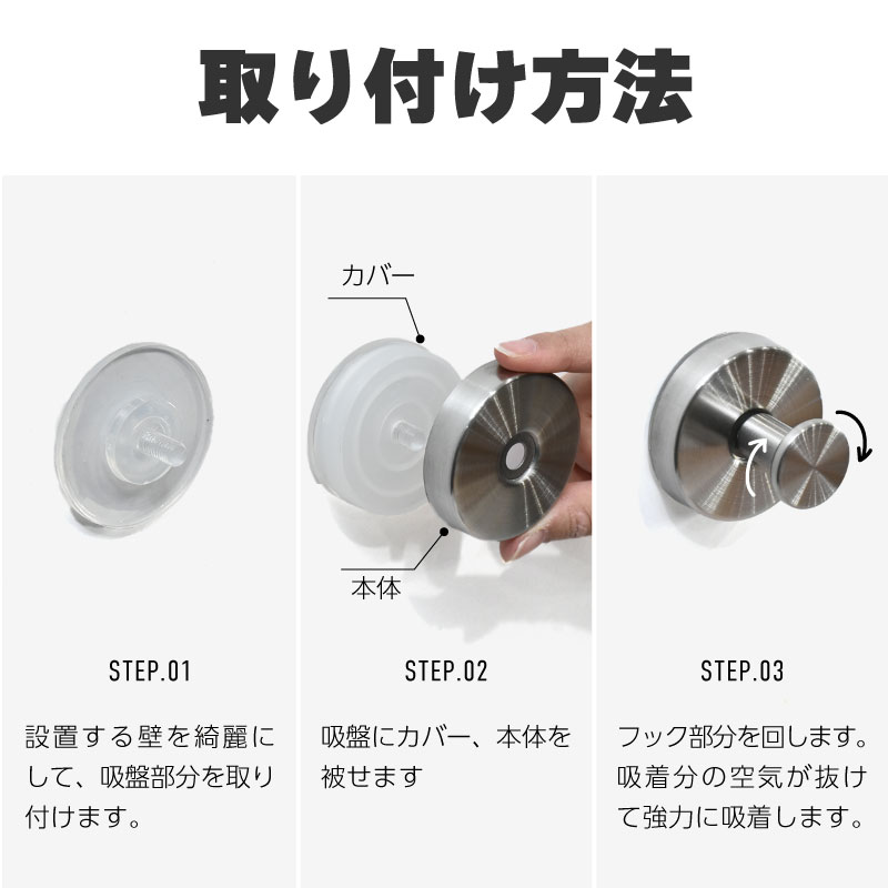 超強力な真空吸着で壁にしっかり密着する吸盤フックです。