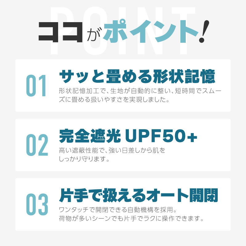 UPF50+かつ99.9%遮蔽性が紫外線をしっかり防ぎ、日傘としても活躍します。