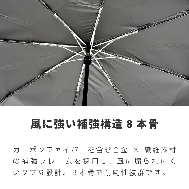 カーボンファイバーを含む合金×繊維素材の補強フレーム採用の8本骨で耐風性に優れ、