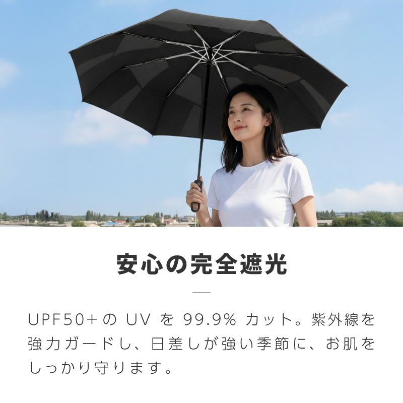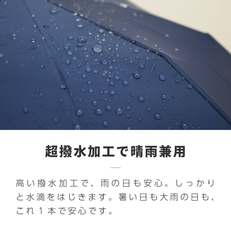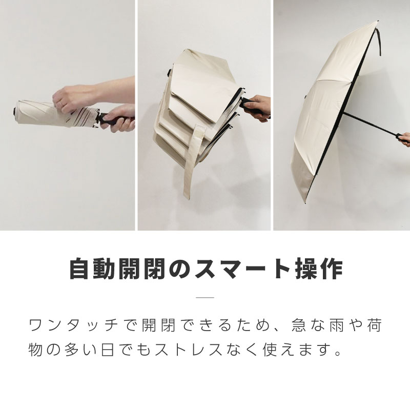 ワンタッチ自動開閉で急な雨にも対応する晴雨兼用モデル。遮光・遮熱仕様で、