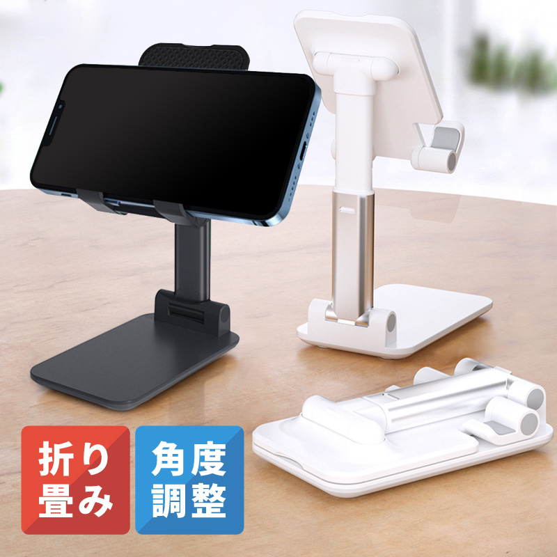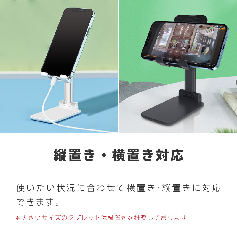 スマホスタンド タブレット ゲーム 卓上 高さ調整 角度調整 充電しながら 縦置き 横置き コンパクト 軽量 自立 折りたたみ 床置き スマホホルダー iphone android アイホン アンドロイド ホワイト ブラック 白 黒 スマートフォン・タブレット対応スタンド。