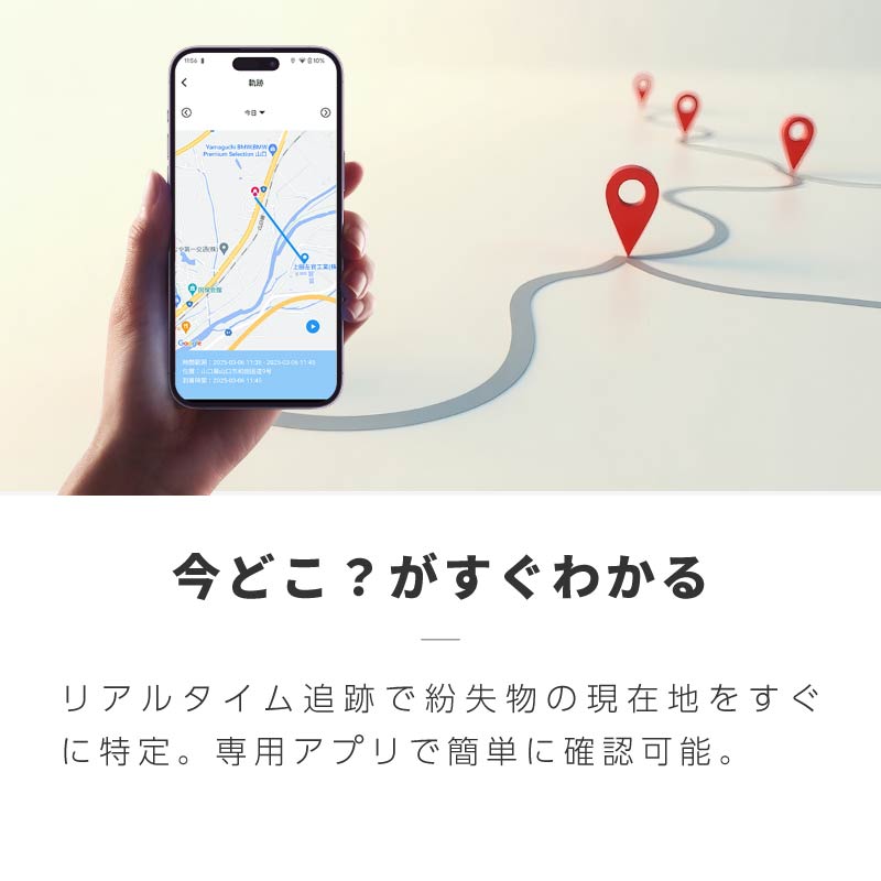 リアルタイム追跡で紛失物の現在地をすぐに特定。専用アプリで簡単に確認可能。