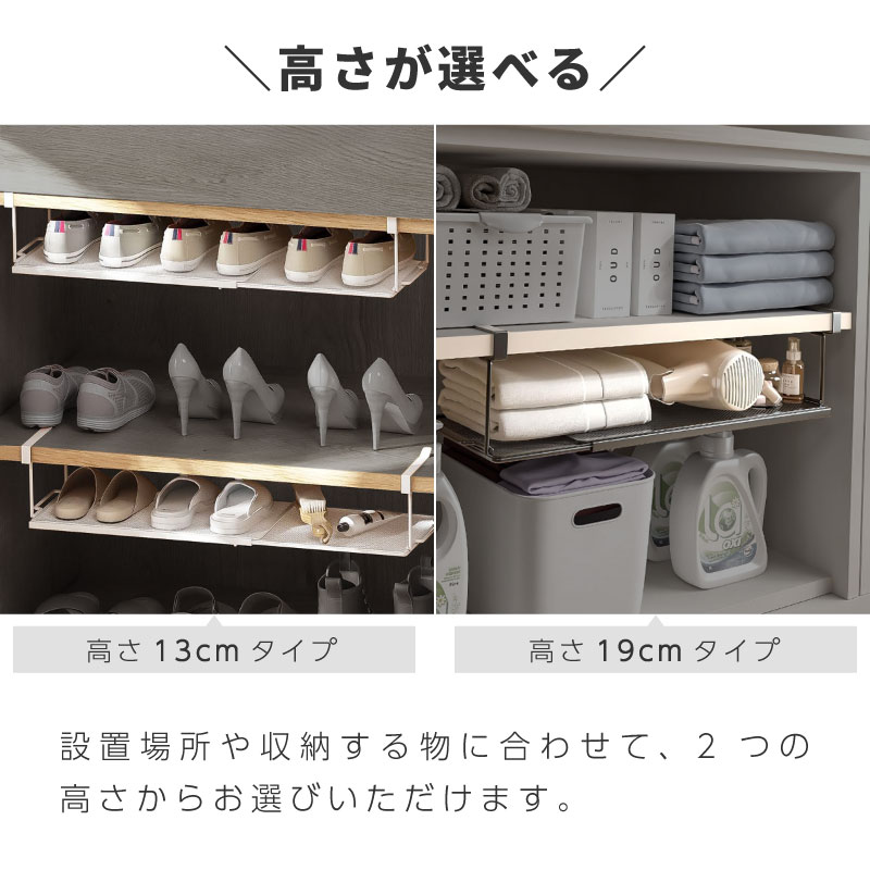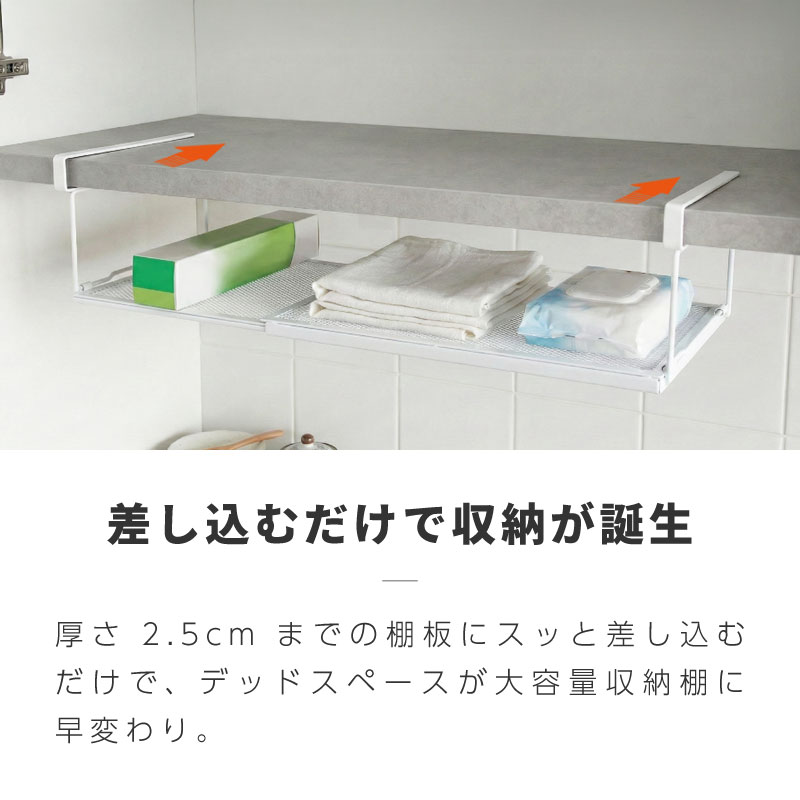厚さ2.5cmまでの棚板に差し込むだけで、組み立てや工具が不要で簡単に設置できます。