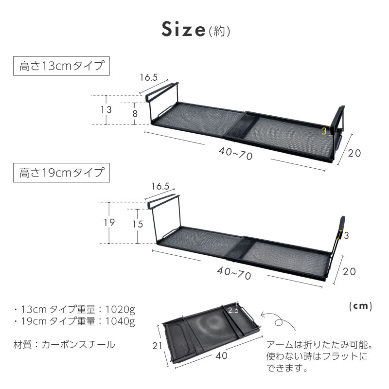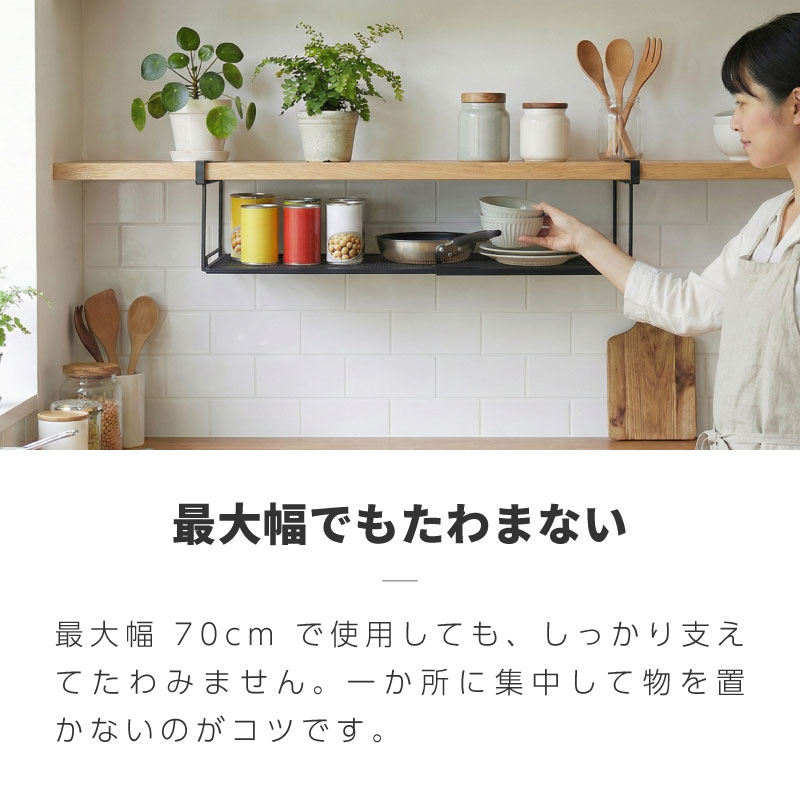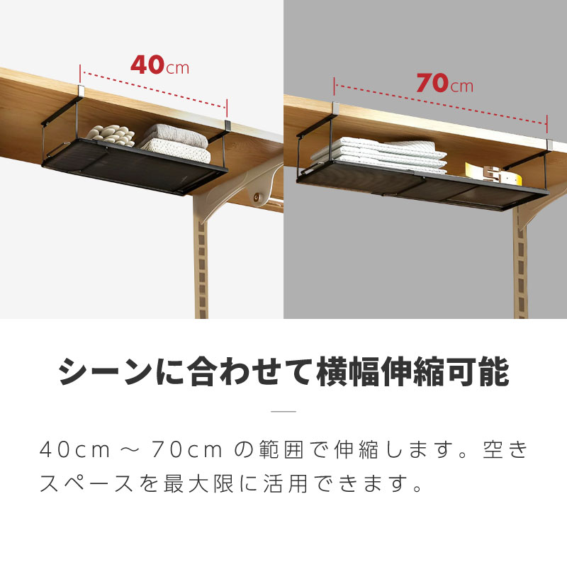 横幅は40cmから70cmまで伸縮可能で、収納量に応じて調整できます。