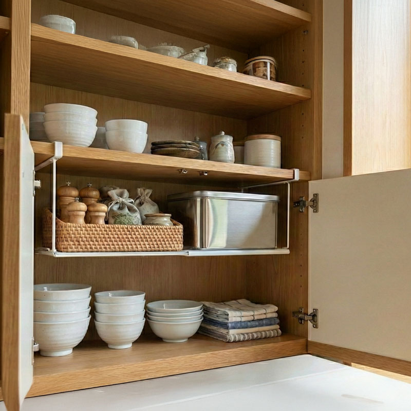 オープン収納や引き出し風収納、クローゼット内の棚板としても活用でき、扉付きシェルフ内でも使用可能です。