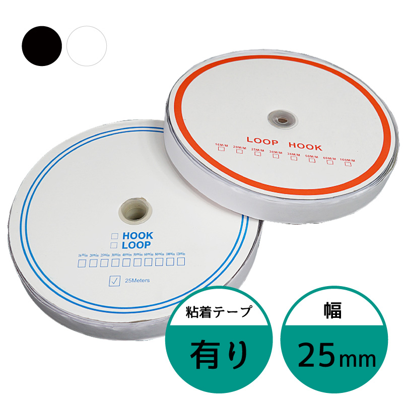面ファスナー 25mm 25M巻き 両面テープあり フック ループ 2本 2.5cm 25ミリ オス メス 縫製用 家庭用 業務用 強力 固定 ホワイト ブラック 白 黒強力両面テープ付き面ファスナーです。