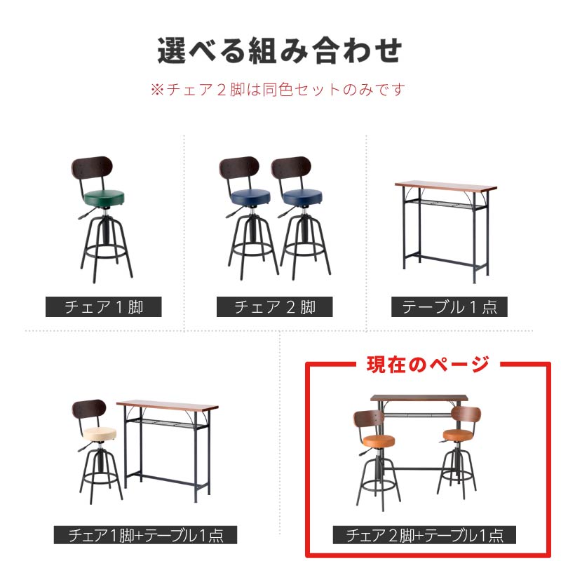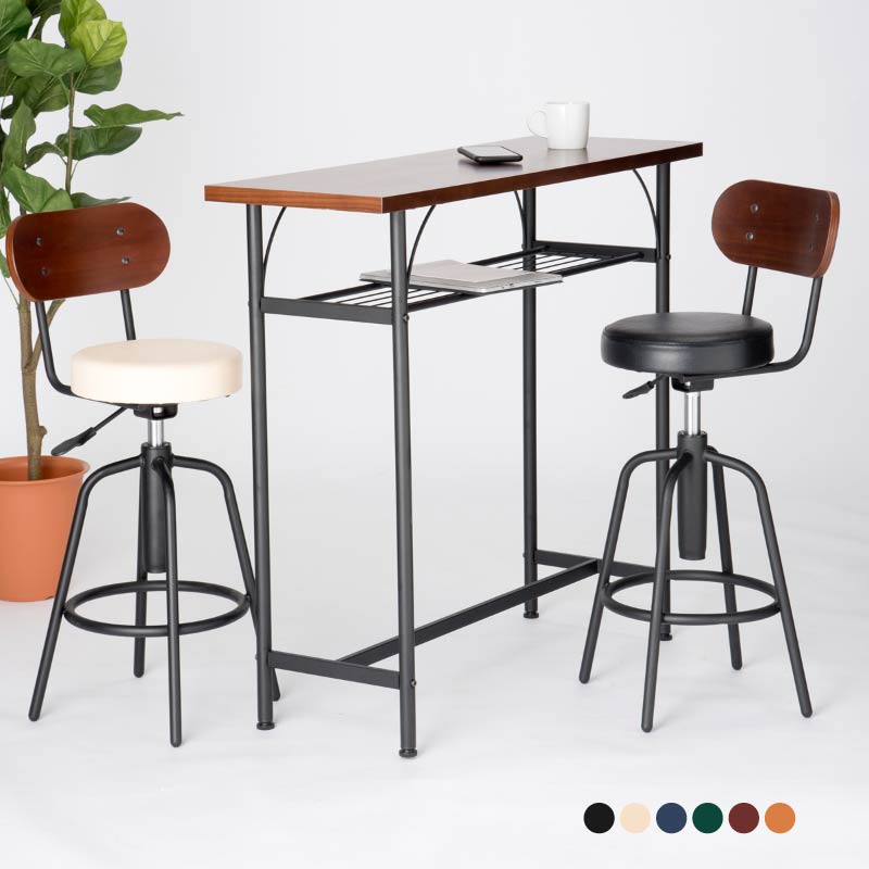 カウンターテーブル カウンターチェア セット ハイテーブル 高さ90cm 幅100cm リビング キッチン スツール 2脚 昇降式 木製 背もたれ付き おしゃれ 回転 バーテーブル キッチンカウンター バーチェア 足掛け付き アイアン 商業施設やオフィスにも使える、高耐久カウンターチェア&ハイテーブルのセット。チェアは昇降・回転機能付きで、快適な動線をサポートします。背もたれには高級感ある木製ウォールナット材を採用。座面は厚さ6cmの高密度ウレタンで、長時間でも快適です。360°回転×ガス昇降レバーで、スムーズな立ち座りと高さ調整が可能。キャスターなし+足置き付きで安定感も抜群。チェアは6色から選べるレトロカラー。PVCレザーが空間に品を添えます。テーブルはスリムなデザインで圧迫感なし。カウンターや作業台、補助テーブルとしても幅広く活躍します。全溶接構造で耐久性も◎。キッチン・店舗・事務所など多用途にフィットする万能セットです。