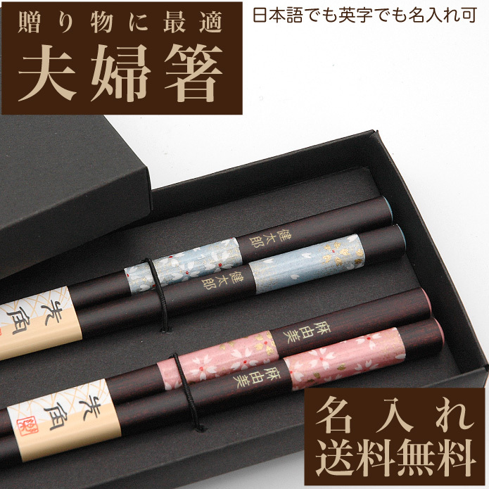 名入れ箸 夫婦箸 先角千代桜 送料無料 天然木 高級黒箱入り メッセージ箸置き 結婚祝い 両親へのプレゼント 伝統工芸